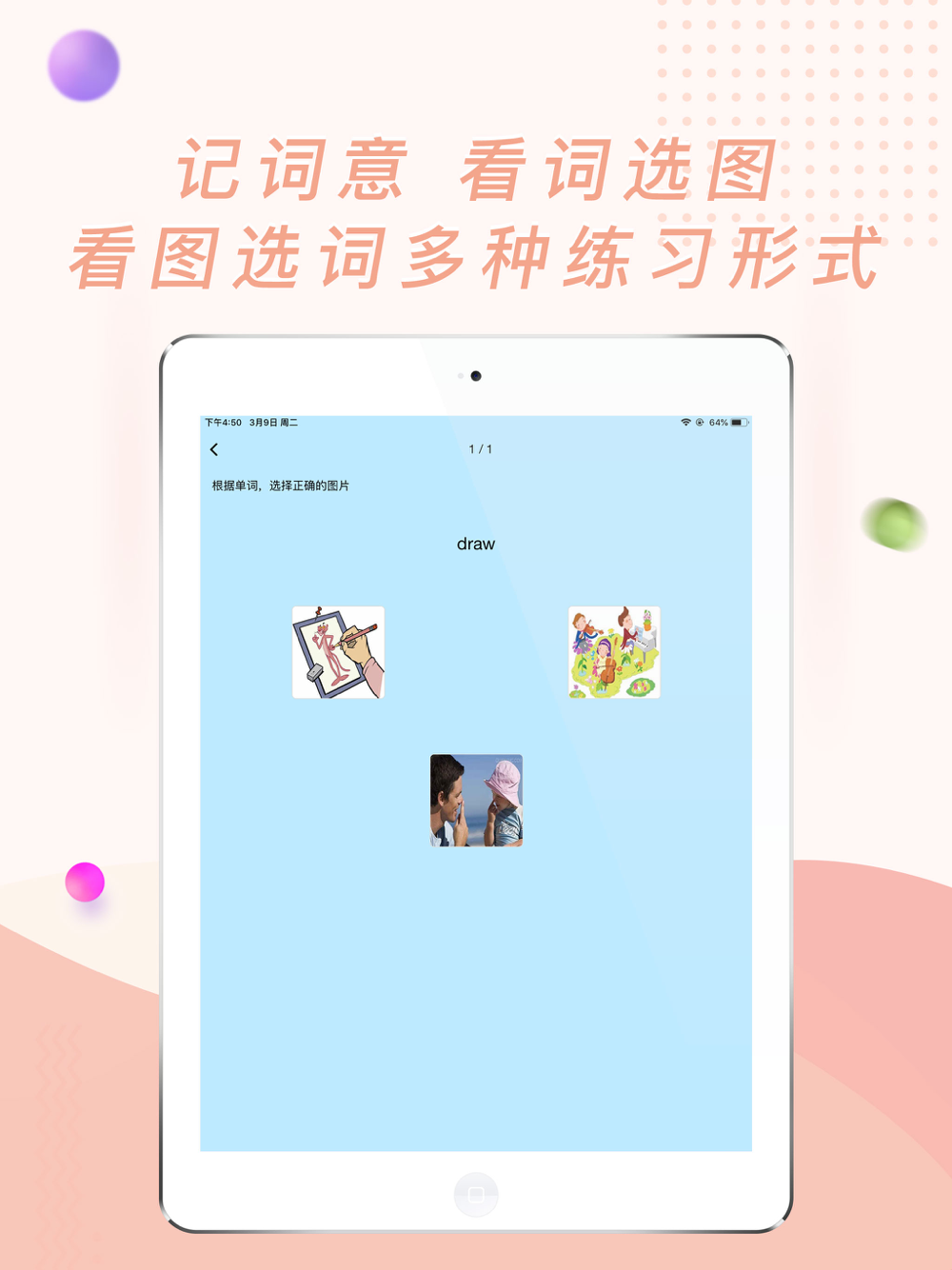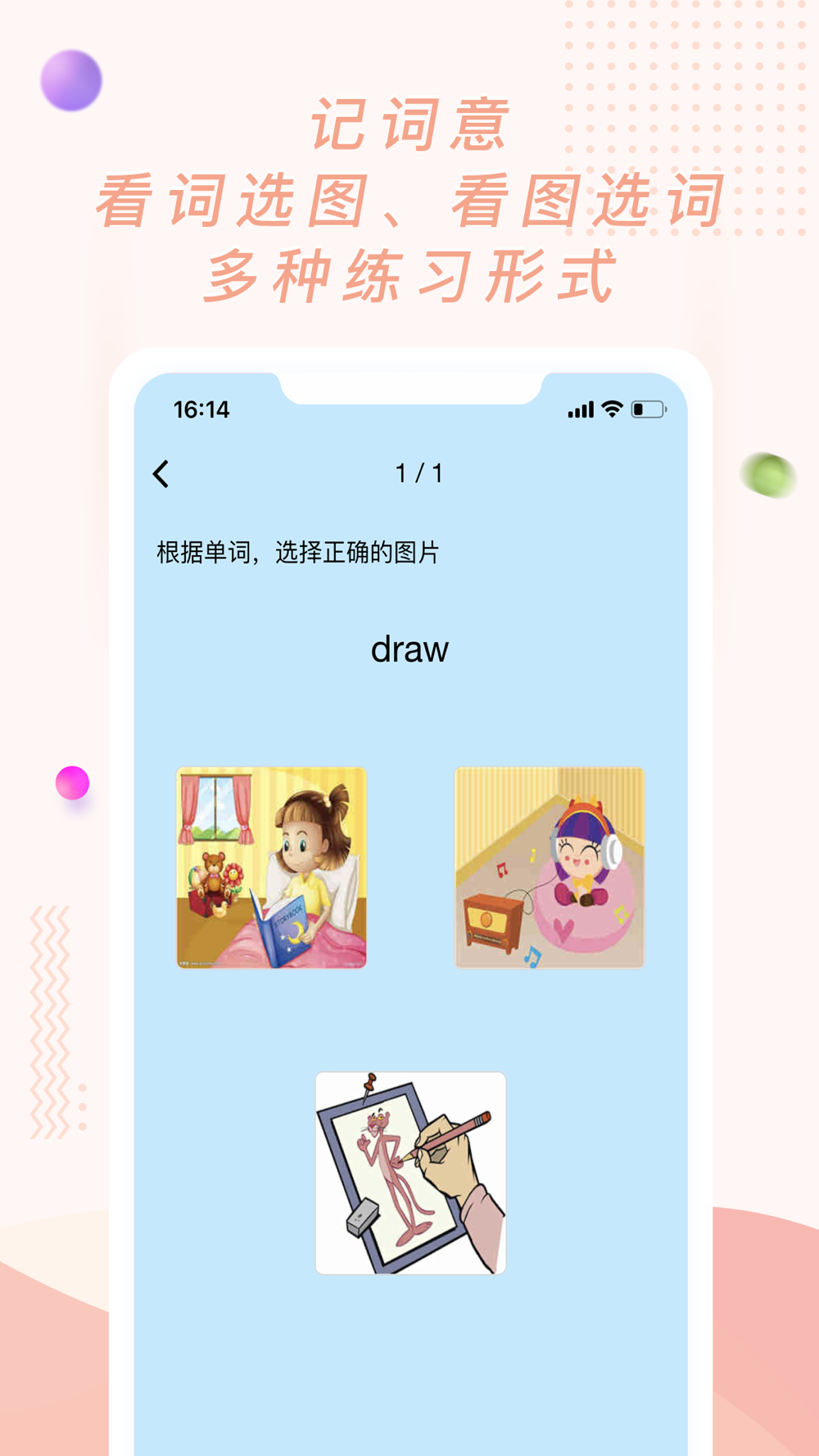 【记词意】:通过看图选词和看词选图两种做题形式,教孩子记住单词释义。