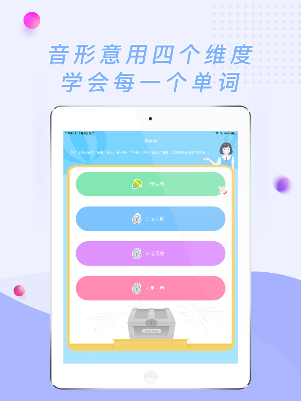 系统设有四步闯关关卡,让孩子会读、会拼、会认、会用每一个单词。