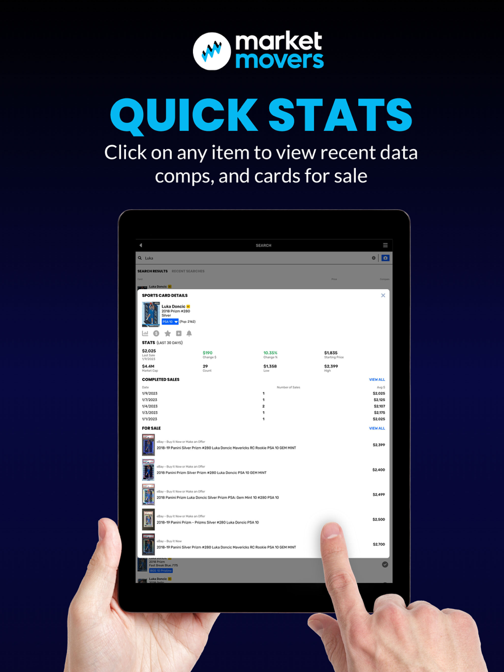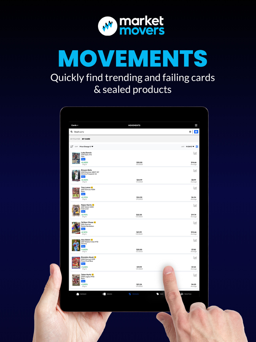 Take your collection to the next level with the all new Market Movers app by Sports Card Investor! The reimagined user interface and all-new suite of features allows you to track your collection and see prices of more than 2 million sports cards (baseball, basketball, football, UFC, F1 & more). Additionally, the app includes non-sports cards and trading card games like Pokemon, Marvel, Star Wars, Magic The Gathering, and many more.