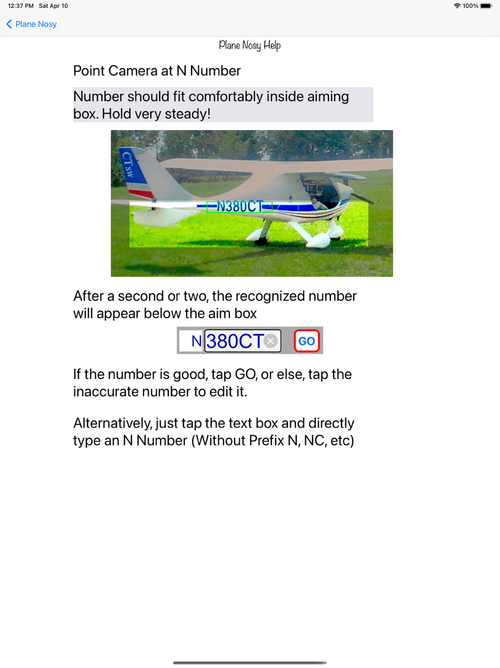 With State-of-the-Art machine vision intelligence, the app will read the number and look it up in the on-line FAA database. Get the Model, Manufacturer, Engine, Owner, Airworthiness category, etc.
