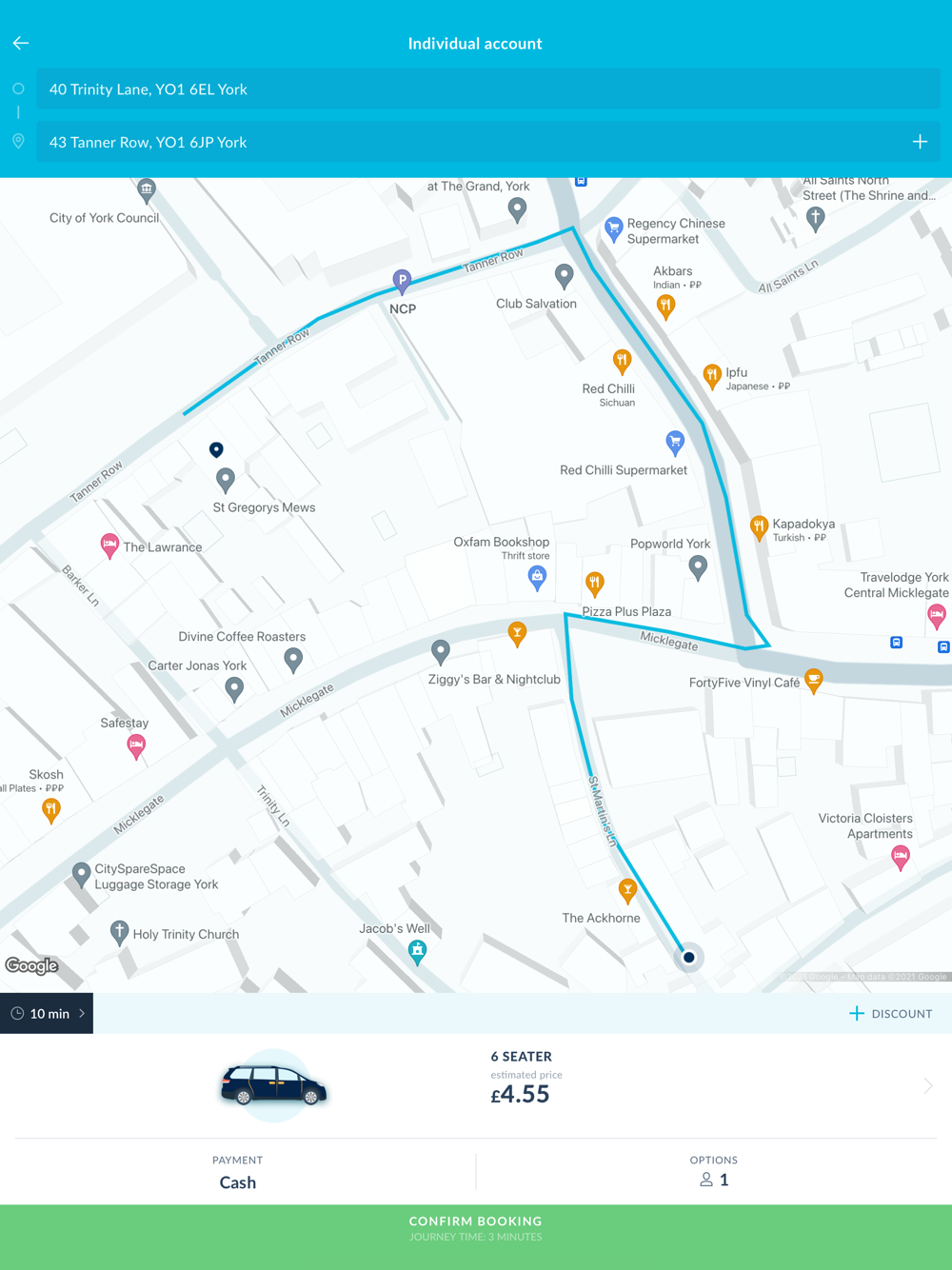 Track your car as it arrives on a map, or call the driver when he's nearby. No more guessing where your Cab might be. Book ASAP or pre-book with a range of payment options, including cash, card and business account. Need an executive or multi seater vehicle? Not a problem, you can book those through the App too.