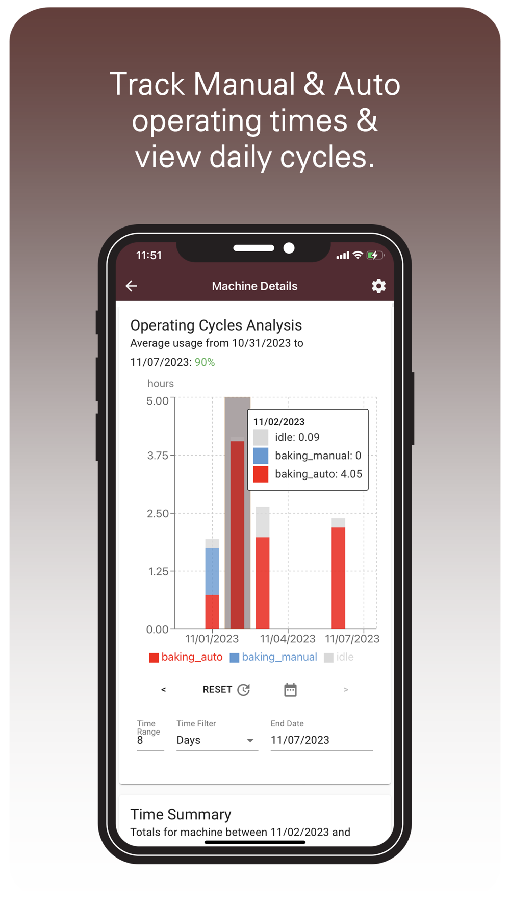 • Baking Cycles: Create better bakery operations and procedures by analyzing oven bake cycles and run-time over days, weeks and months in the easy-to-use graphs.
