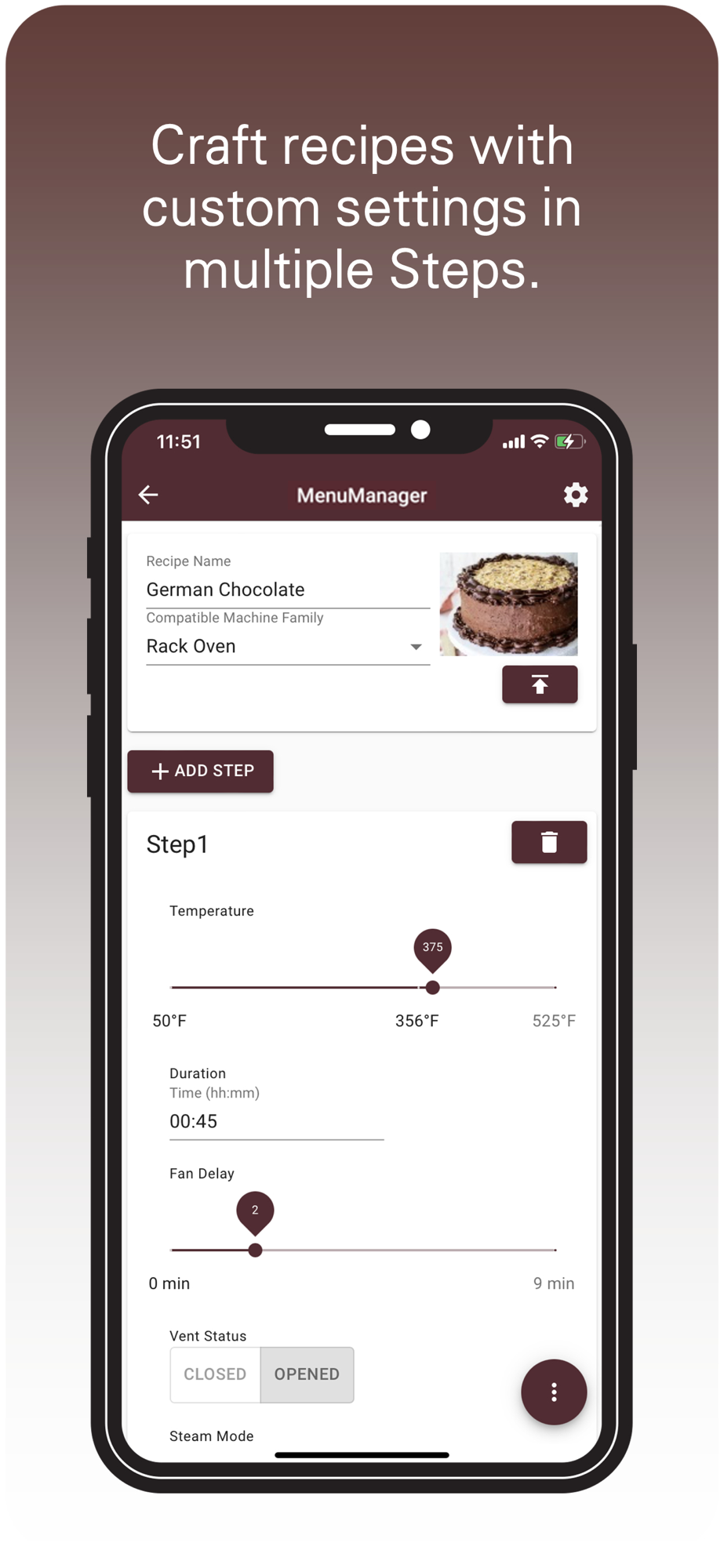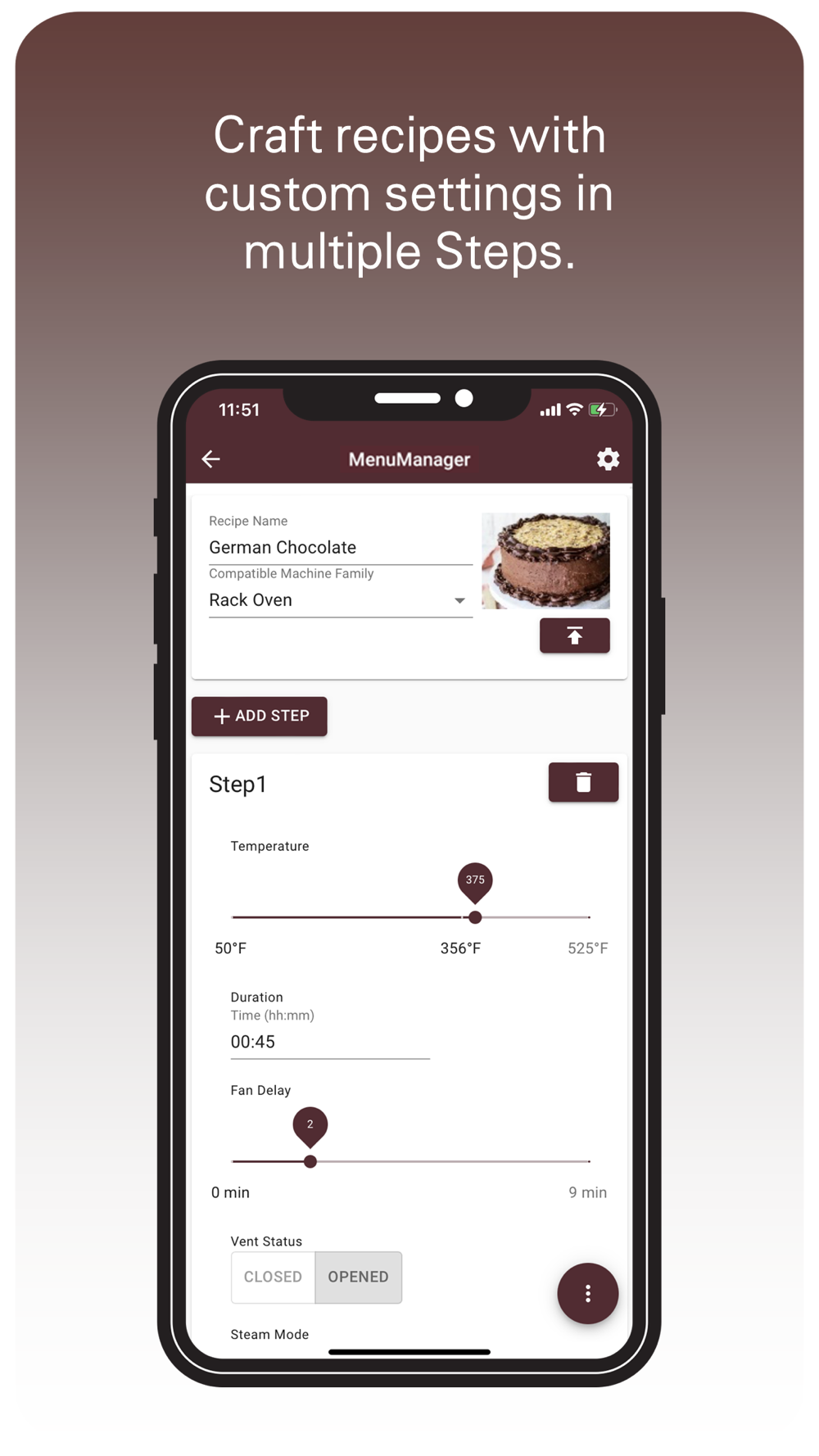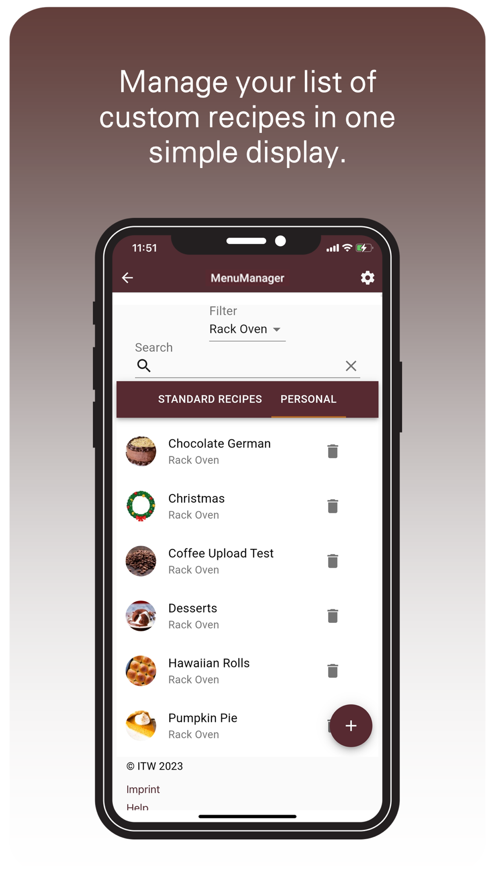 • MenuManager: Create custom recipes on the mobile MenuManager and upload them to any Baxter Rotating Rack Oven or Mini Rotating Rack Oven in your fleet.