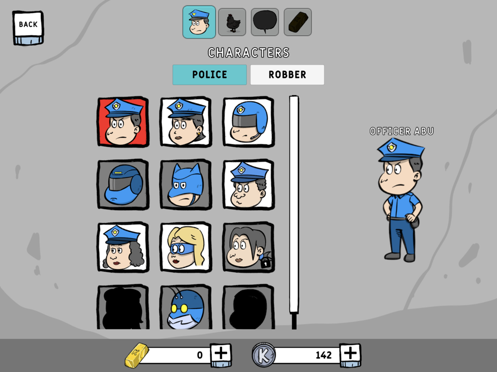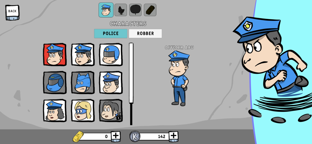 Robbers can rank up by rescuing their comrade from prison. Police can rank up by catching a ‘ranked up’ robber. Higher ranks will give a speed increase.