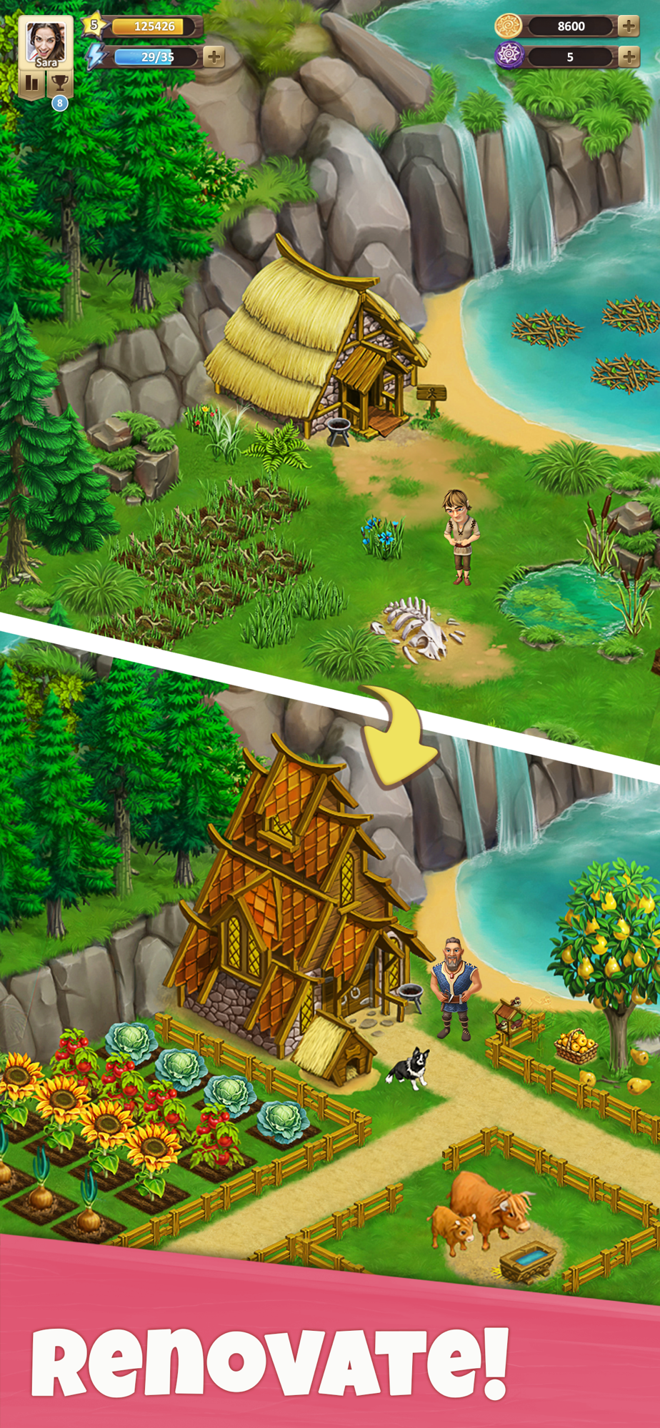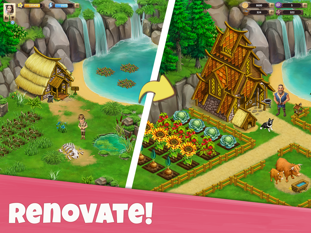Set off for the unexplored lands of Farland, which hold many secrets and amazing discoveries in this exciting new adventure! You will meet true friends who left their homes because of a terrible disaster. In the mysterious lands of Farland, they are trying to find a new home, but without your help, they won't be able to cope... Helga the Noisy is a good friend, a wonderful hostess and a capable helper, she can always cheer you up and find a way out of any situation. Halvard the Silverbeard is a wise mentor, always ready to help, share experience and take care of everyone in the village. In Farland, everyone will find an activity to their liking: IMPROVE and develop your village and farm! COLLECT harvests and open new recipes! DECORATE your village in the way you want! RAISE animals, get new pets and dress them up in cute outfits! EXPLORE numerous new lands full of adventure and interesting stories! MEET new characters and learn their exciting stories! ENJOY amazing adventures in new lands: reveal secrets, uncover plots, and help your friends! MAKE decisions on what the wild lands of Farland will look like! Create a thriving farm, a beautiful city and an amazing garden! CHOOSE where the storyline will go! How to make your farm the most productive, what lands to visit and whom to help. It's within your power to make this wild land prosperous. Fascinating stories are waiting for you!