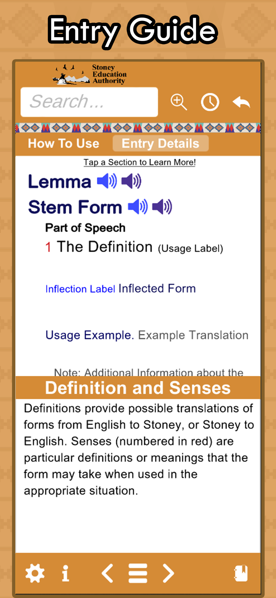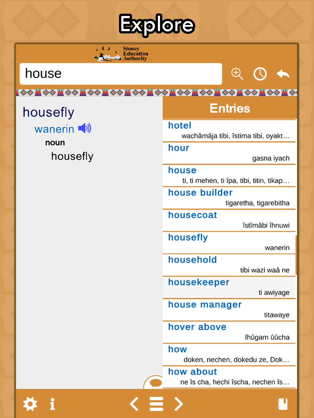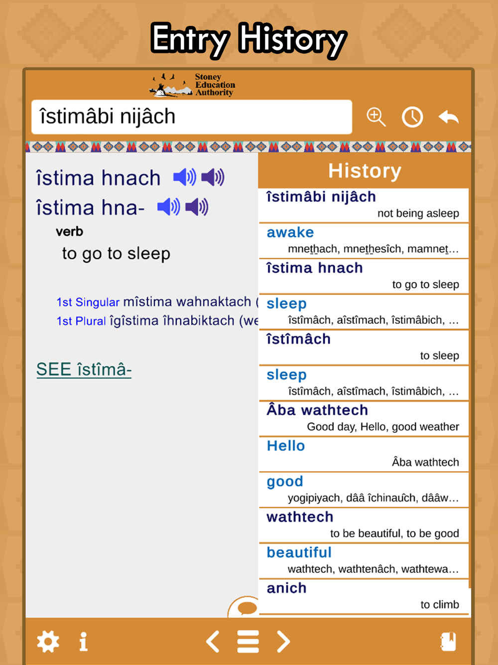 • There are two sides to the Stoney Mobile Dictionary. If you are currently viewing a Stoney word, you are on the “Stoney” side. The left and right buttons will take you to the next or previous Stoney word in alphabetical order. Tapping the Hamburger button will provide you with a list of the nearest alphabetical words to the entry you are currently looking at