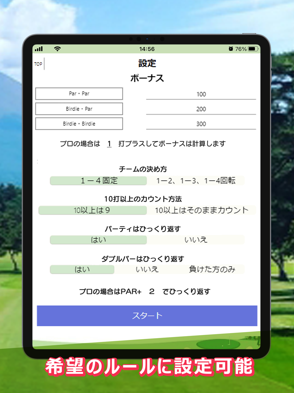 チームの決め方、10打以上の数え方、バーディの際のスコアひっくり返り等、プレイするメンバーによってルールの変更が可能です。