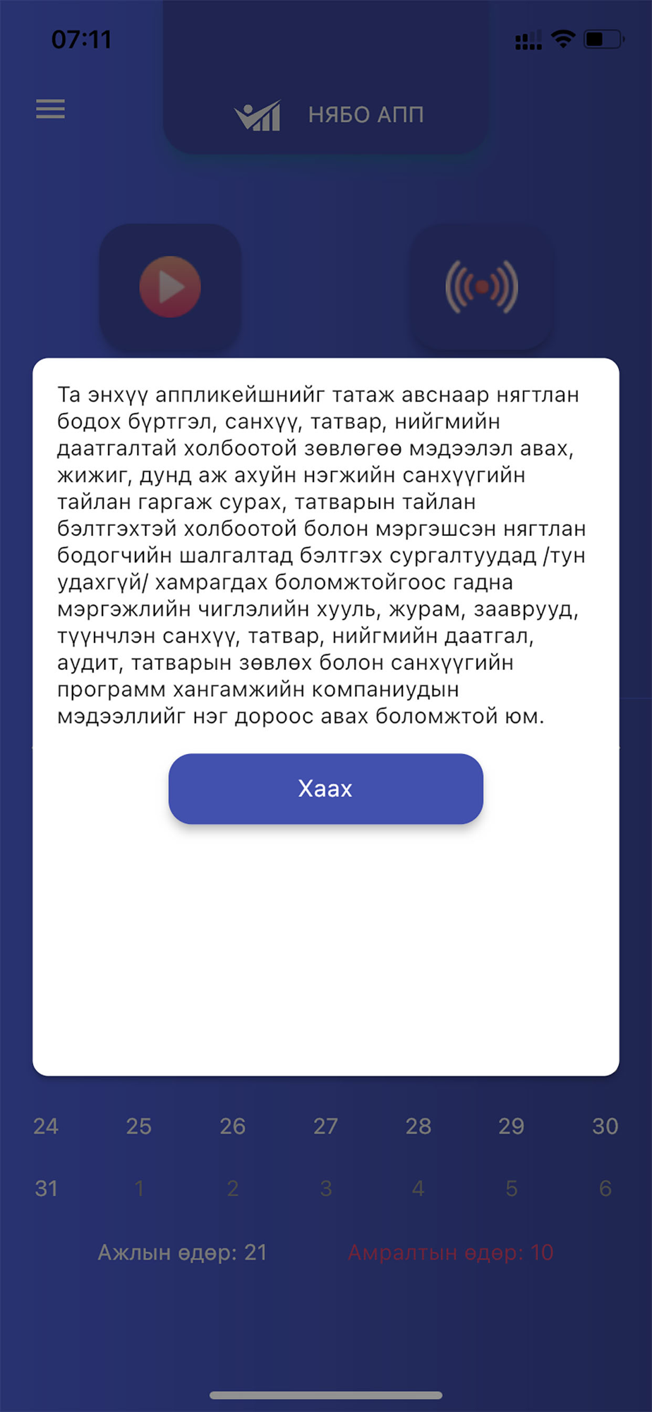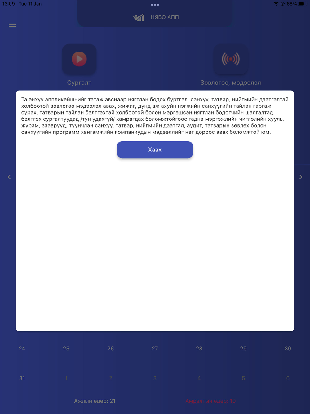 Та энхүү аппликейшнийг татаж авснаар нягтлан бодох бүртгэл, санхүү, татвар, нийгмийн даатгалтай холбоотой зөвлөгөө мэдээлэл авах, жижиг, дунд аж ахуйн нэгжийн санхүүгийн тайлан гаргаж сурах, татварын тайлан бэлтгэхтэй холбоотой болон мэргэшсэн нягтлан бодогчийн шалгалтад бэлтгэх сургалтуудад /тун удахгүй/ хамрагдах боломжтойгоос гадна мэргэжлийн чиглэлийн хууль, журам, зааврууд, түүнчлэн санхүү, татвар, нийгмийн даатгал, аудит, татварын зөвлөх болон санхүүгийн программ хангамжийн компаниудын мэдээллийг нэг дороос авах боломжтой юм.