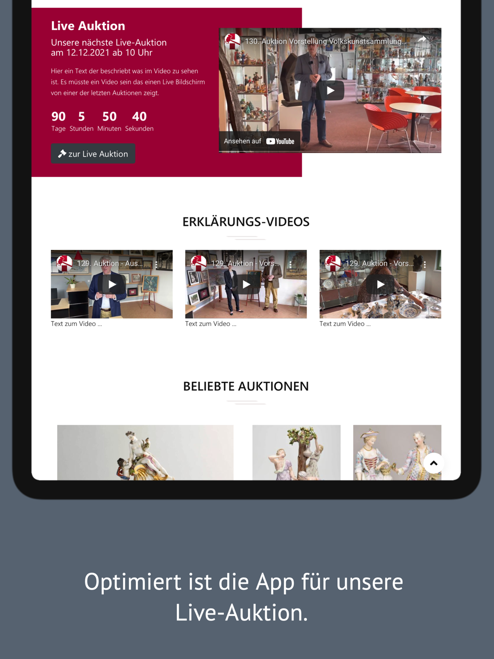 Liebe Freunde des Auktionshauses Heickmann, wir freuen uns Ihnen hier unsere App präsentieren zu dürfen. Mit der App haben Sie immer einen Überblick über unsere aktuellen Auktionen sowie Ihre personalisierten Merklisten und Gebote. Optimiert ist die App für unsere Live-Auktion. Sie erhalten eine App-Benachrichtigung, kurz bevor Ihr Objekt in der Live-Auktion aufgerufen wird. Sie können direkt in der App Ihre Gebote live erhöhen, sehen die Auktion mit Bild und Ton, können reagieren, wenn Sie überboten wurden. Nach einmaliger Anmeldung in der App bleiben Sie dauerhaft angemeldet.