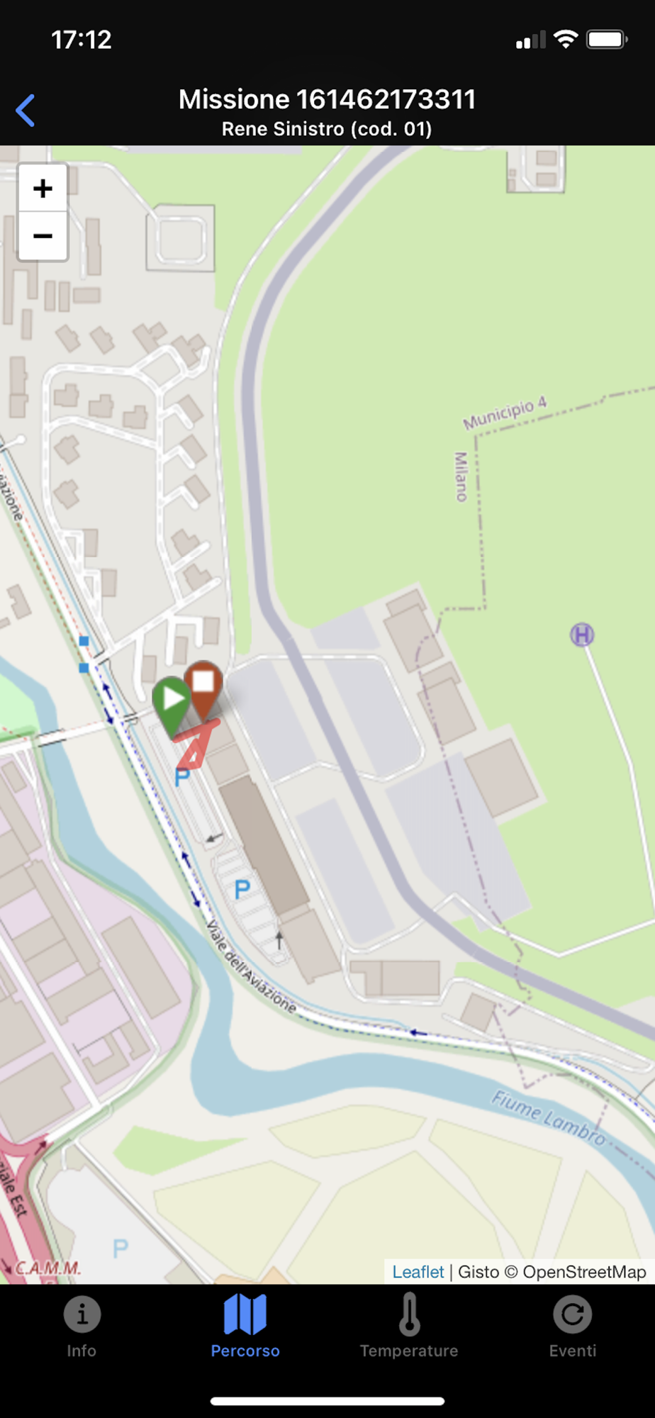 GistoApp elenca le missioni di trasporto in corso nelle ultime 24 ore, e per ognuna visualizza il percorso di spostamento, il grafico della temperatura dell'organo, lo stato della missione.