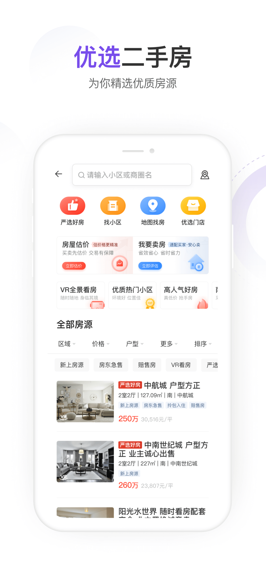 长三角地区的房地产综合服务平台,提供新房、二手房、租房等多种服务,根据自己的需求来搜索到符合要求的房源,房源真实可靠。专注于二手房,新房,租房,为您提供最新最全的房源信息。真实房源在售,定制找房需求,为您匹配精准房源。VR全景看房,足不出户看好房!