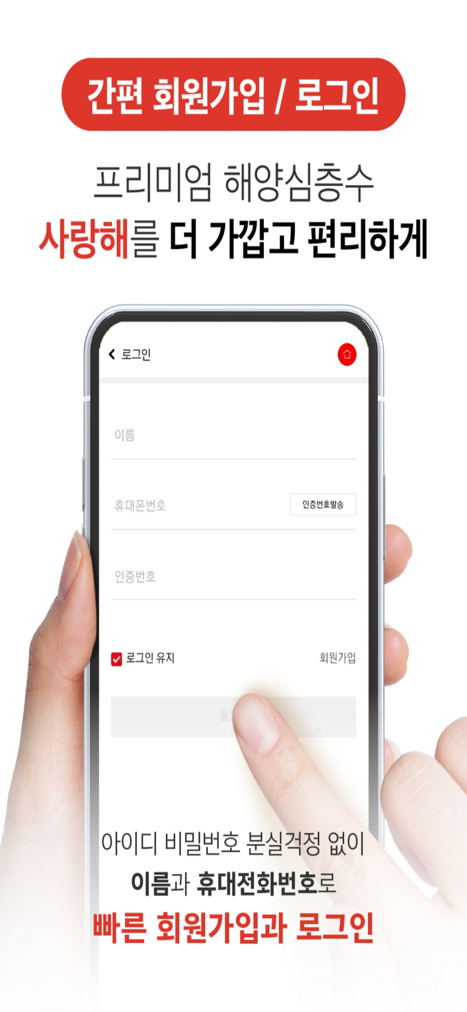 스마트폰 앱으로 쉽고 간편하게 주문할 수 있는 해양심층수 사랑해 전용 어플리케이션.