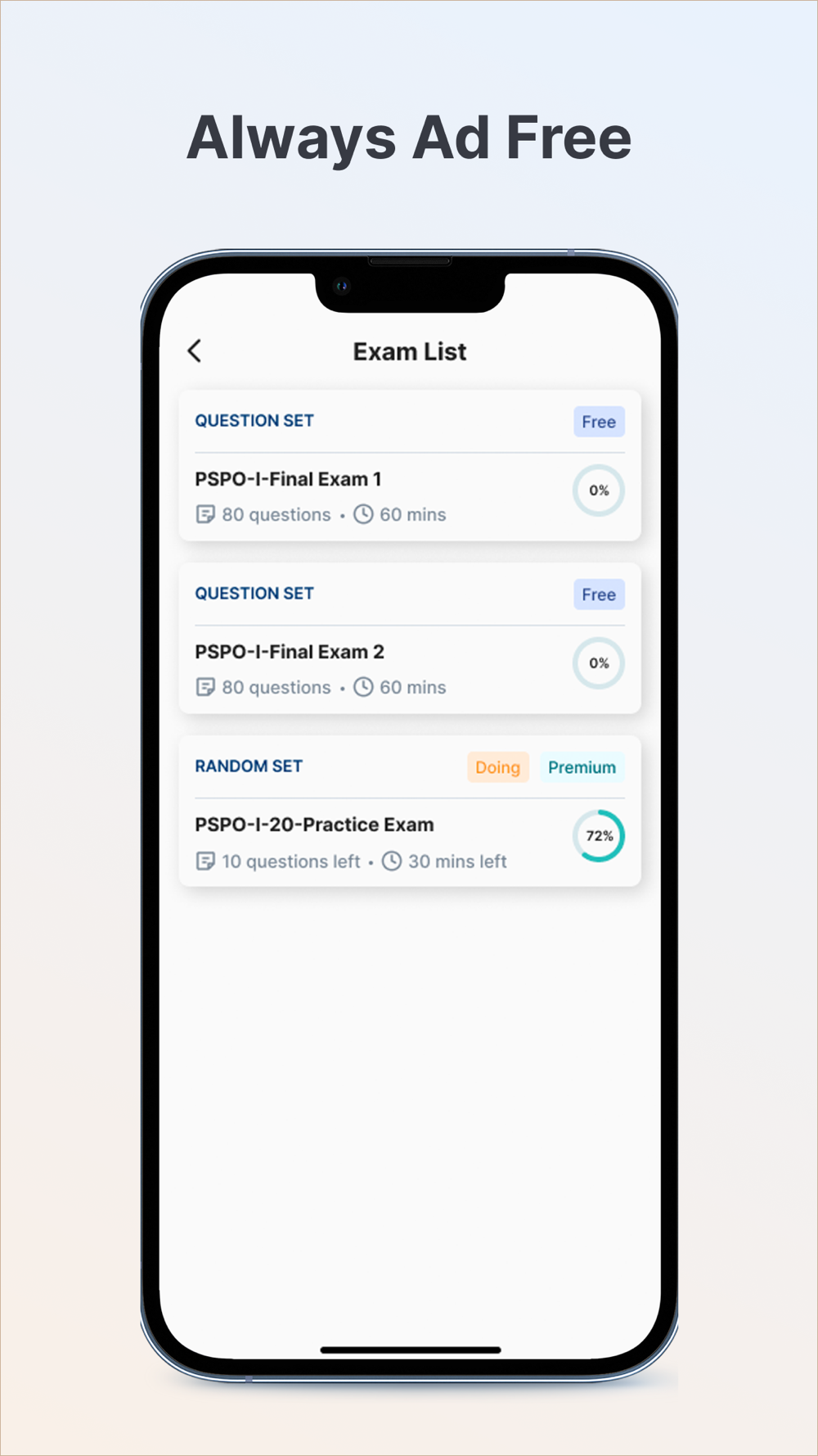 We consistently update our question database with authentic exam content. By regularly practicing with our Scrum exams and aiming for a minimum score of 85% across all your attempts, you'll be well-prepared to excel in the actual Scrum examination. Download the PSPO Exam Simulator now to familiarize yourself with the Scrum exam. Our application is accessible from anywhere and at any time, providing you with flexibility in your exam preparation.