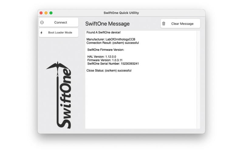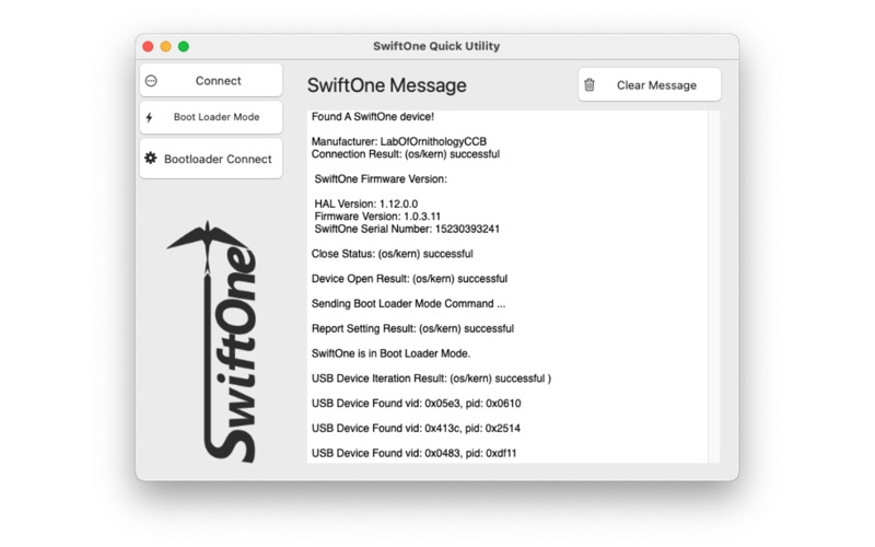SwiftOne Quick Utility is a tool for quickly connecting to a Swift or SwiftOne Recorder. The tool can quickly retrieve the device information on a macOS computer and set it into a boot loader mode for programming with STM32 Programmer software.