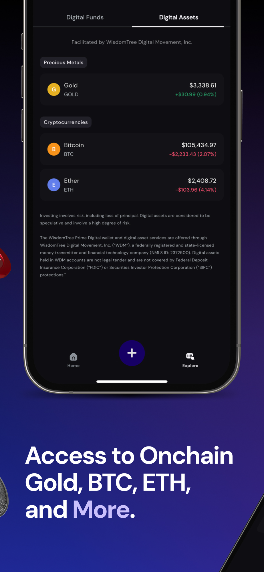 From direct deposits and tools to pay your bills, to accessing cryptocurrencies like Bitcoin and Ether, investing in tokenized assets like Onchain Gold and Digital Funds, and using a debit card to fund your spending with your digital assets—WisdomTree Prime offers all these features in a single, user-friendly app.