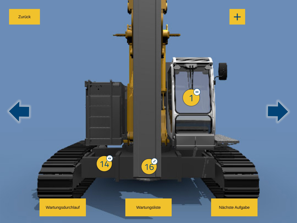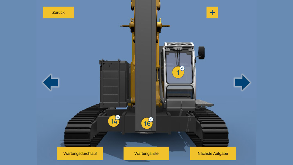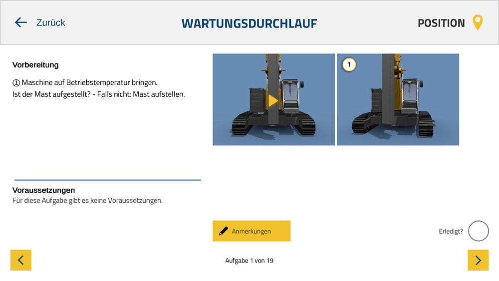 In RTG Service ist der Umfang von der täglichen 10 Stunden Wartung bis hin zur Jährlichen 2000 Stunden Wartung in digitalen Wartungslisten aufgeführt. Die Maschine lässt sich durch Streichen über den Bildschirm navigieren. Zu jedem Wartungsschritt gibt es eine Kurzanleitung mit dazugehörigem Video und Bildmaterial. Durch Zoom auf die Maschine wird dem Techniker die die Position zum Wartungsschritt angezeigt.