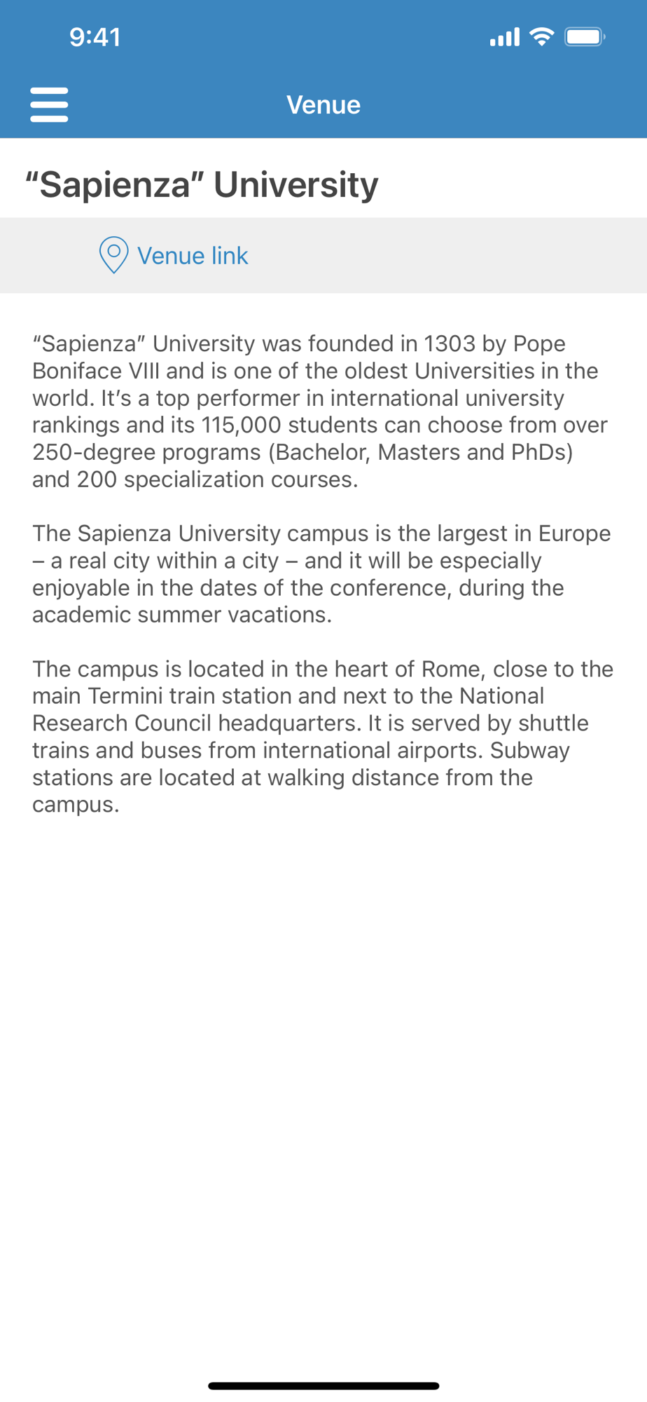 * Easy access to conference's key information (venue, accommodation, sponsors etc.)