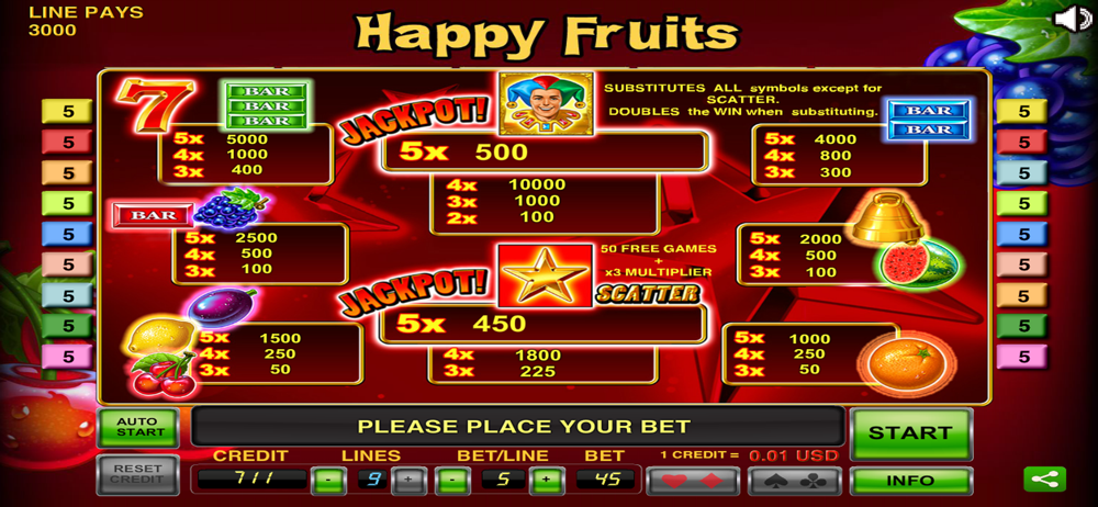 Nine lines across five reels Happy Fruits Slot promises opulent gaming entertainment.