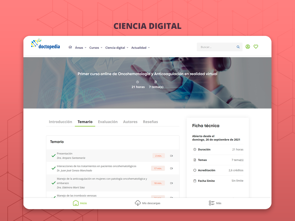 Doctopedia es plataforma online de formación médica continuada para los profesionales de la salud en España. Cuenta con decenas de cursos online que se renuevan periódicamente, en una formación teórica y práctica, muy visual y amena. Acreditados por el SNS y de interés para la práctica diaria de su profesión.