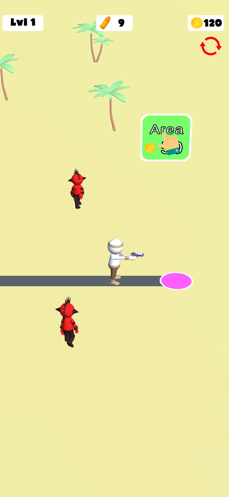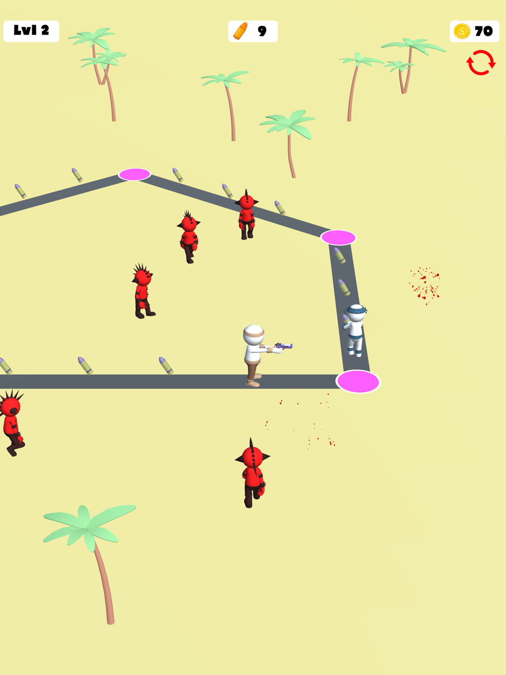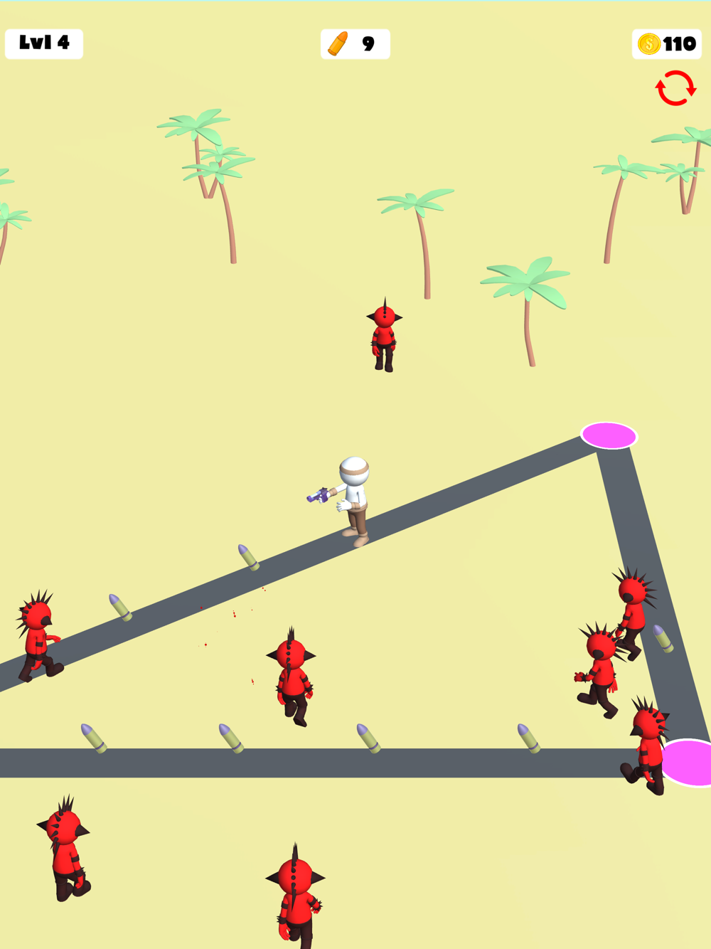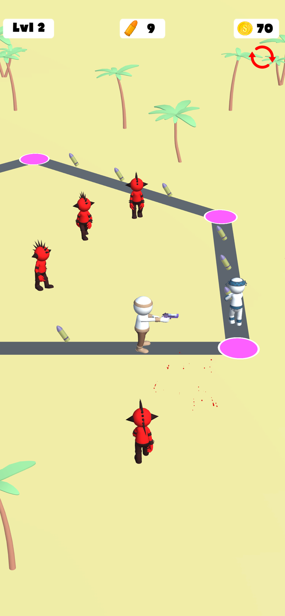 Run around, collect bullets and kill the enemies. Get new ways with earned coins and keep killing enemies.