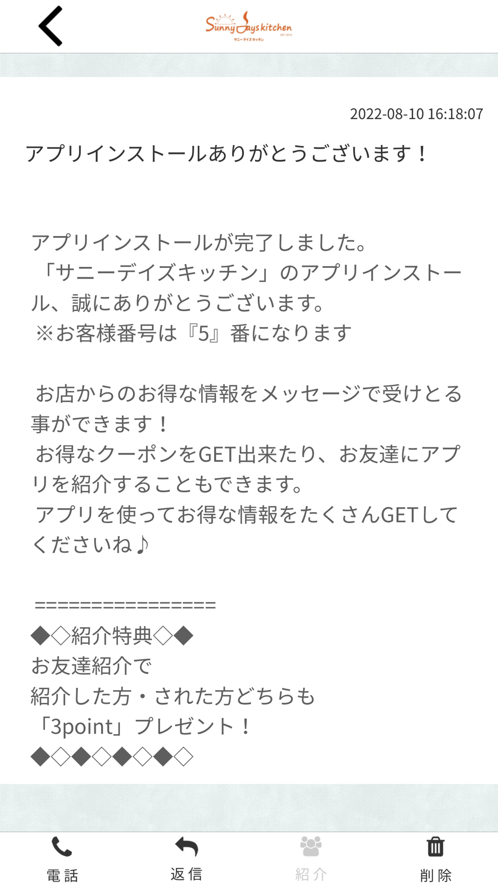 サニーデイズキッチンのアプリをSNSを通じてお友達に紹介する事ができます。