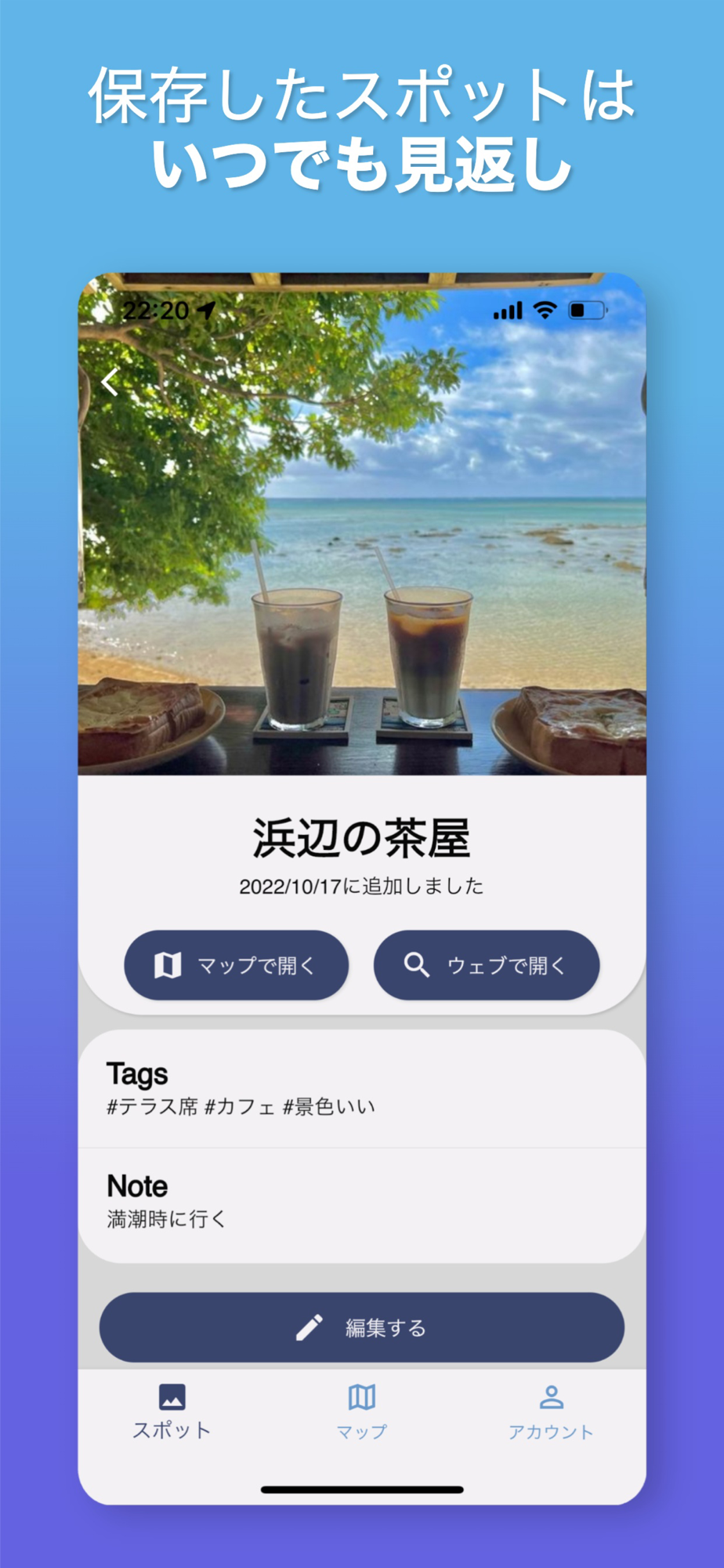 Safariを含むさまざまなアプリから、ワンタップでお出かけスポットを保存・まとめることのできるアプリです。