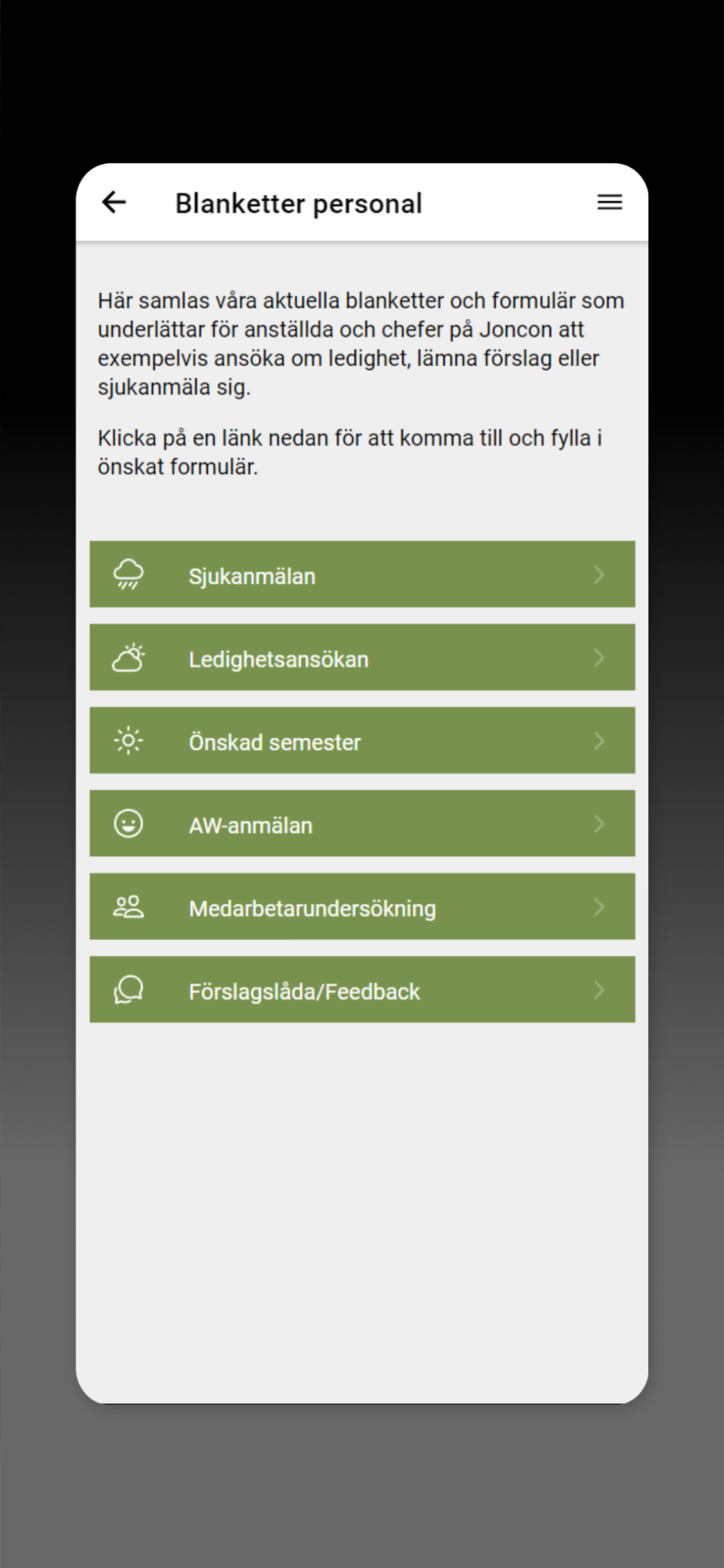 I appen för Joncon kan du som behörig ta del av en förenklad arbetsdag genom b.la. olika digitala dokument och checklistor. Du kan även ta del av informationsflöde, blanketter, kontaktuppgifter och mycket mer.