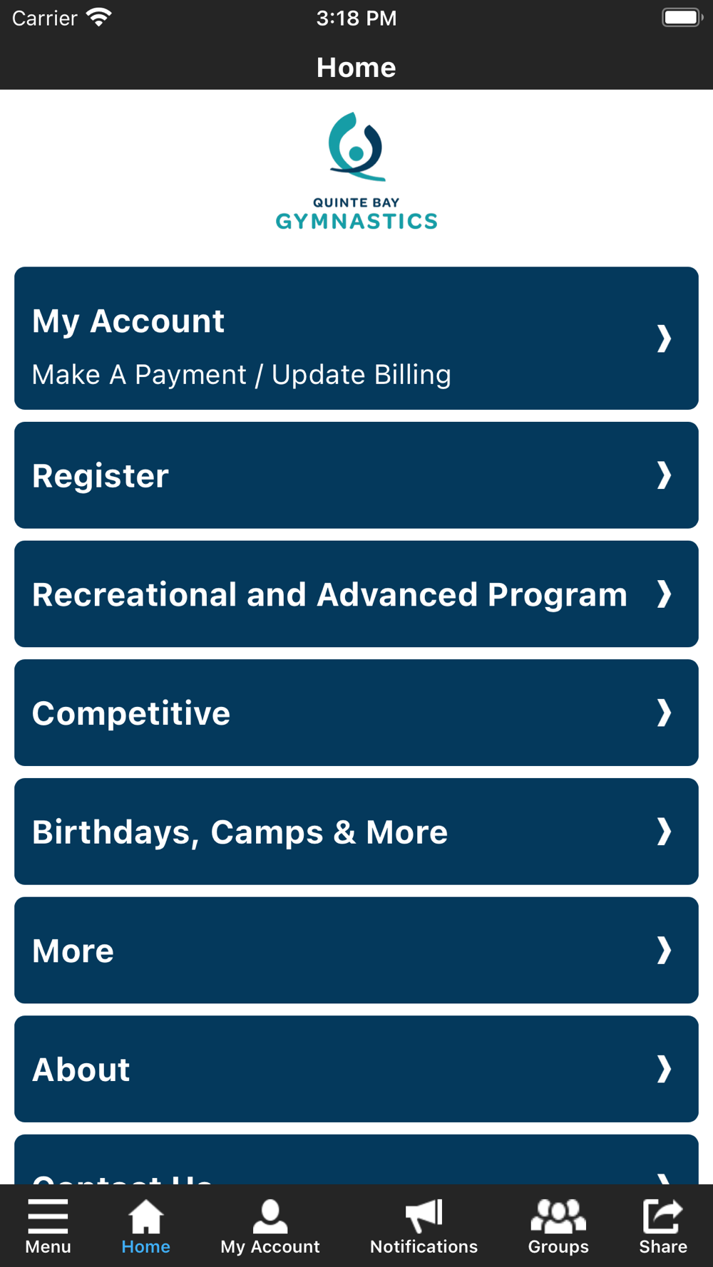 The QBGC app allows you to manage your account with ease, register for classes, parties, and special events. You'll also receive important notifications about class changes, closings, registration openings, special announcements, and upcoming events.