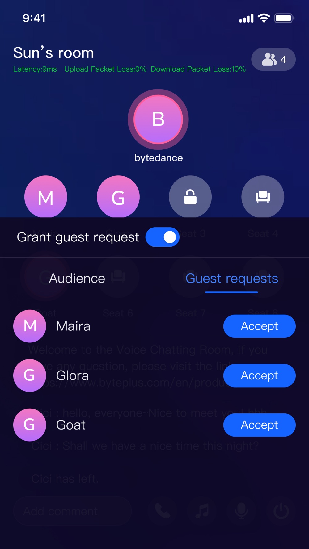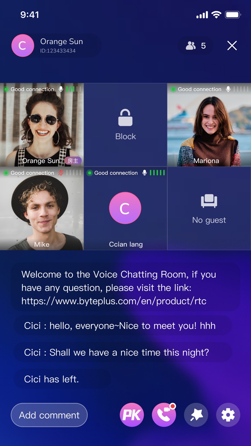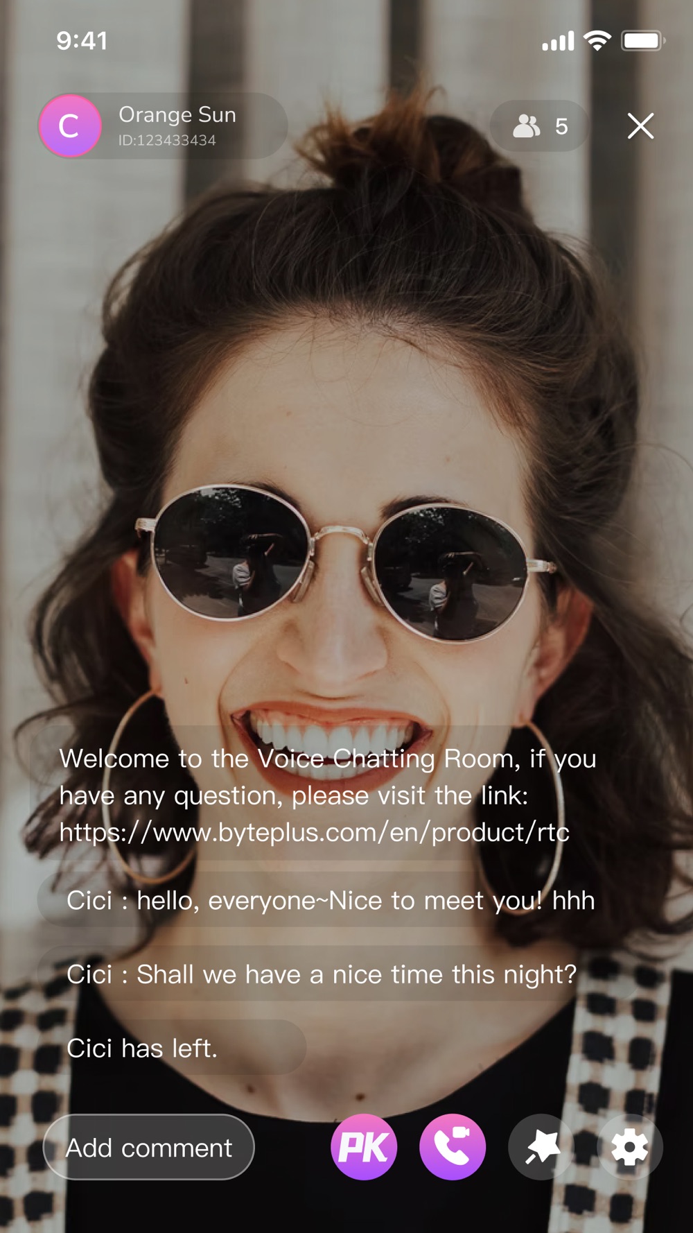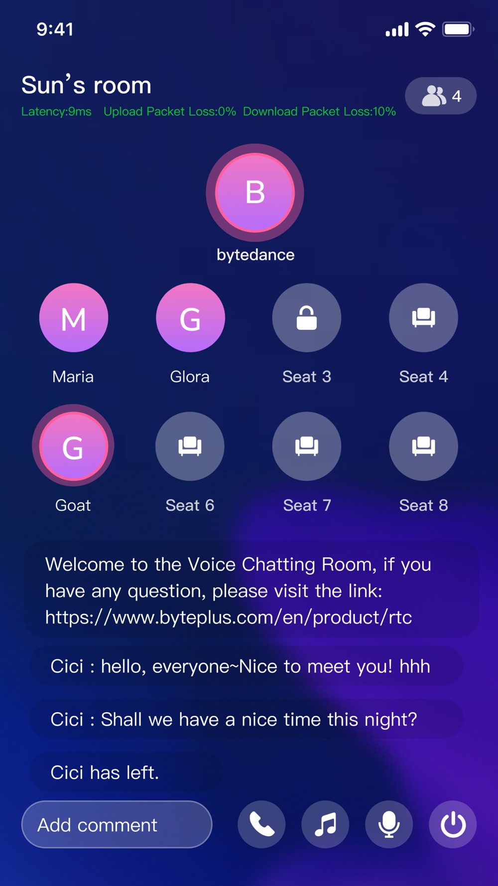 -In this application, you can enjoy a high quality interactive scene service of low latency with BytePlus RTC, such as video call, chatting room, and interactive video streaming.
