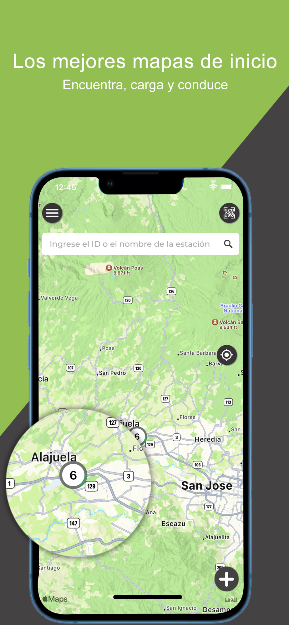 • Vista de mapa predeterminada para verificar la disponibilidad de la estación de carga cercana