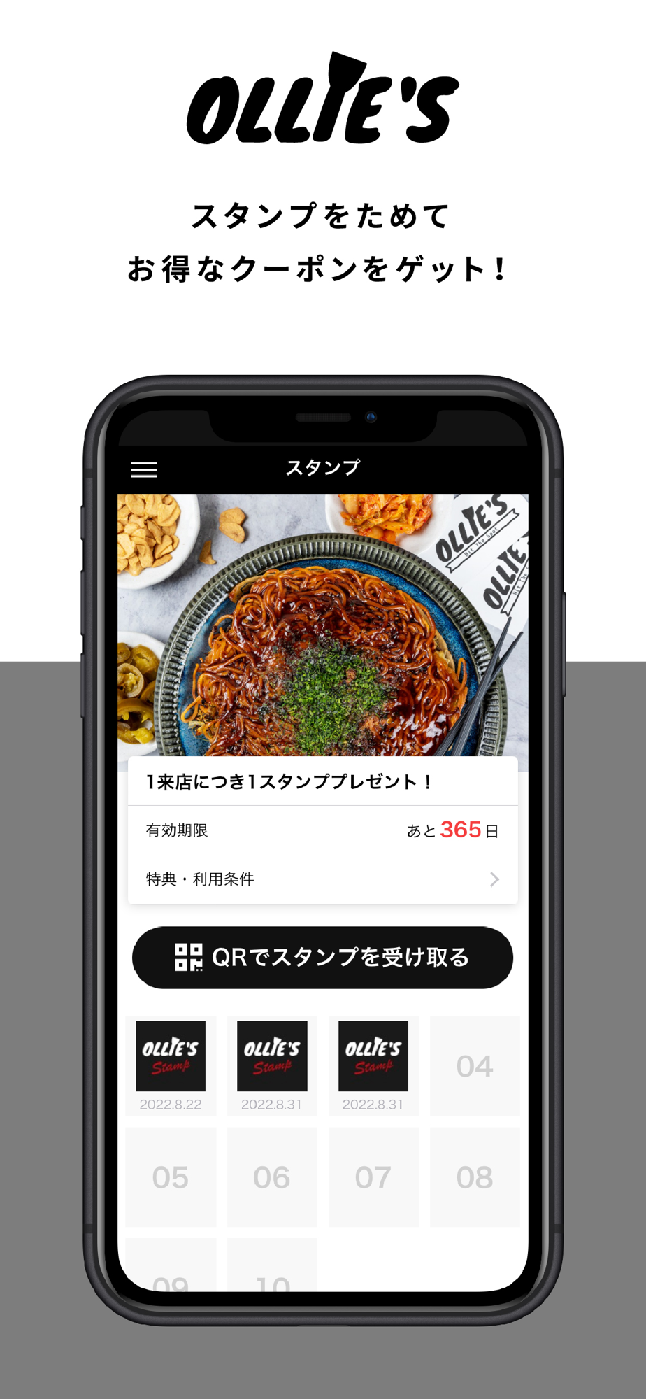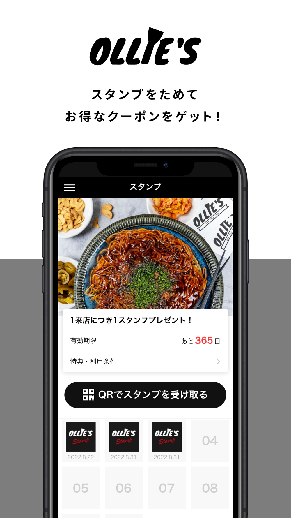 アプリ内にはスタンプカード機能も搭載! 「OLLIE’S」のご利用でスタンプがたまると、 お得なコンプリートチケットが発行されます。