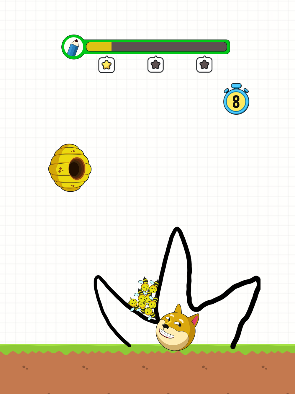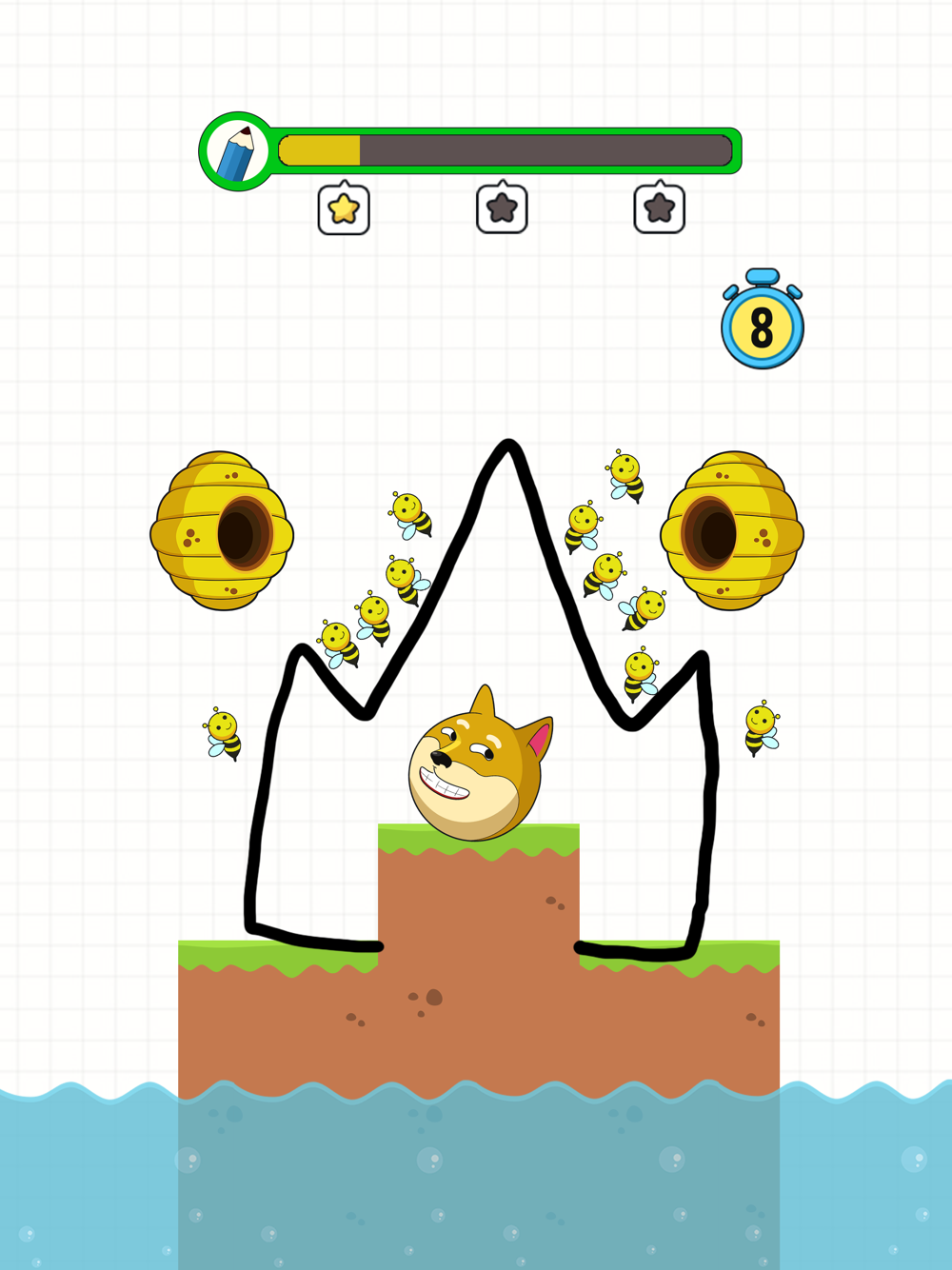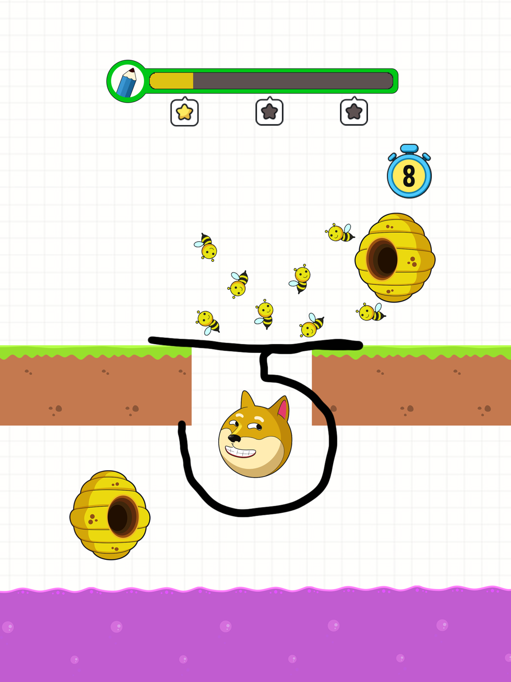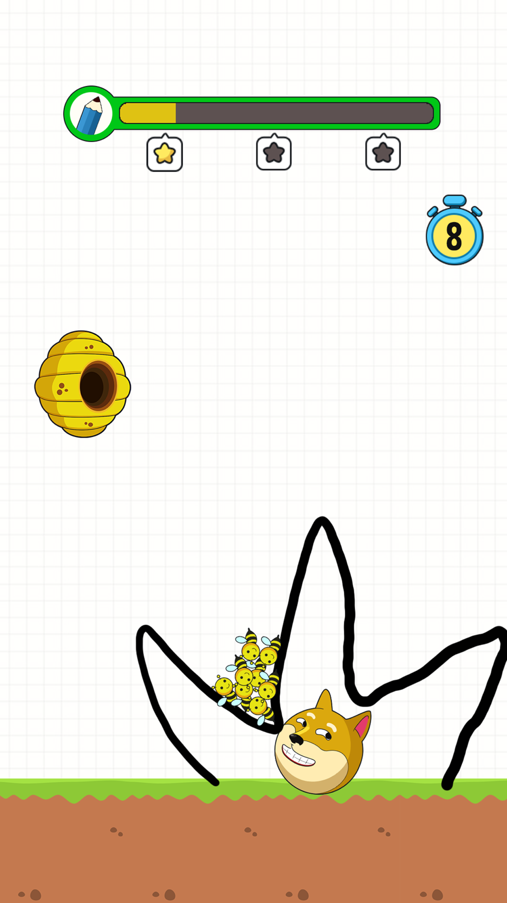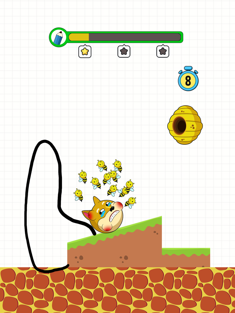You can go on to the following level after saving the dog. The less ink you use, the higher rate you get. If you fail, please try to draw again to save the dog from bees. Try to win as many levels as you can this entertaining & simple game to sharpen your brain! Also, share with your friends and play save the dog bee together!