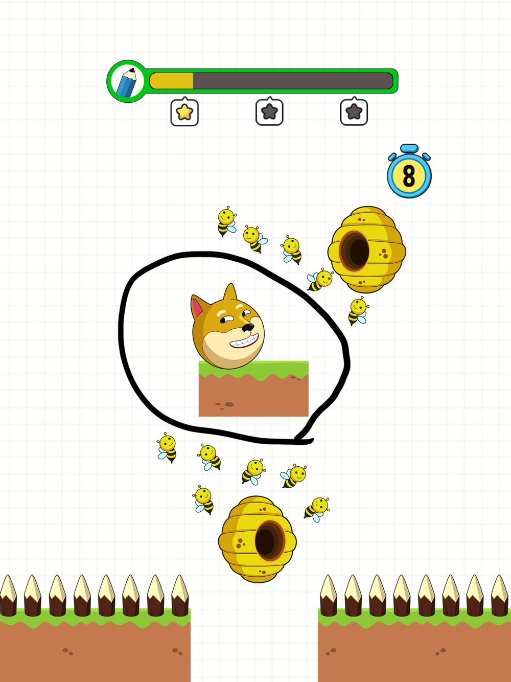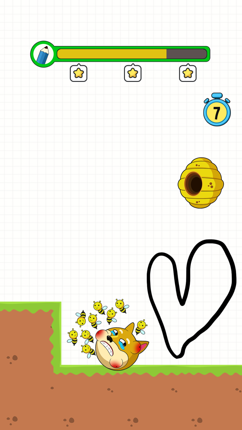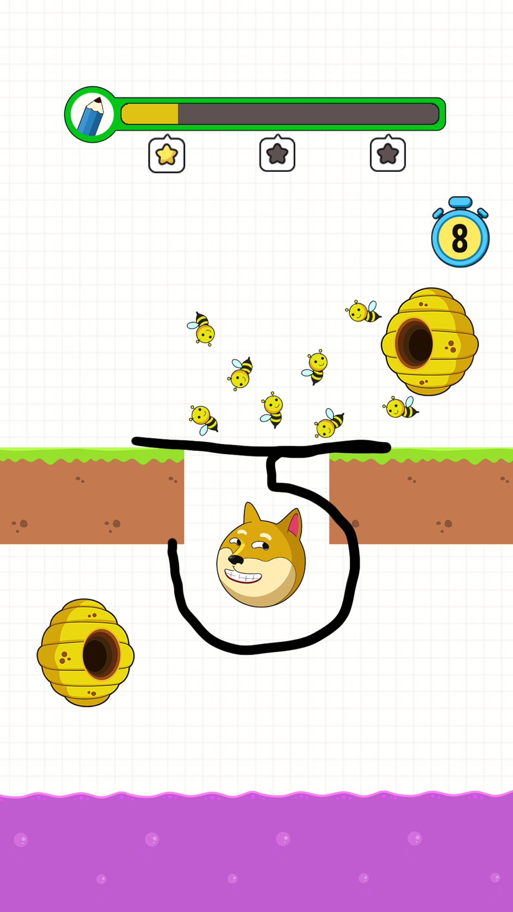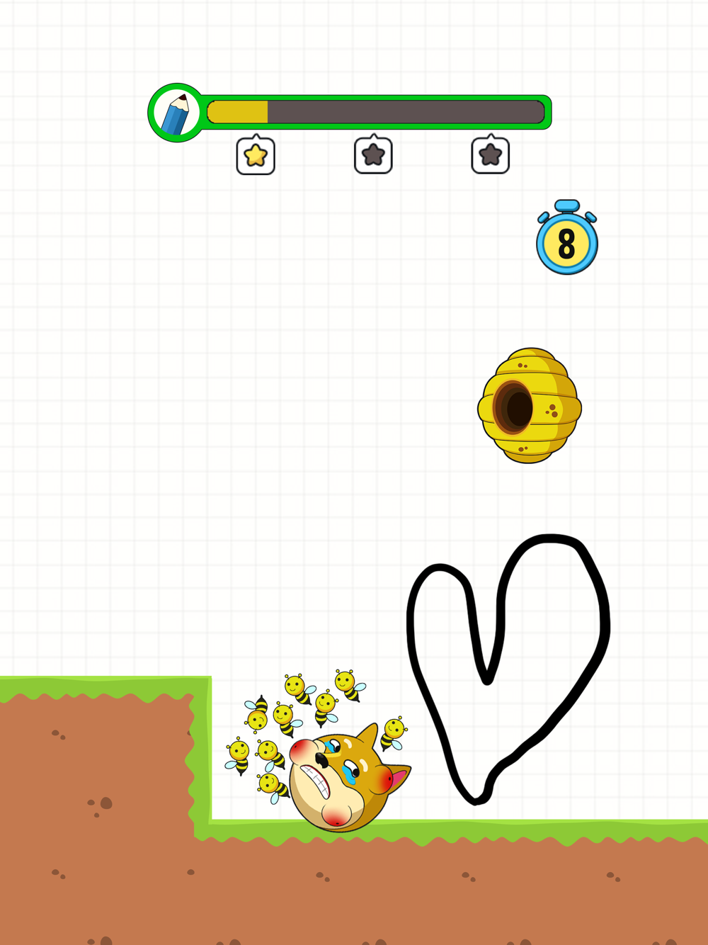 You can go on to the following level after saving the dog. The less ink you use, the higher rate you get. If you fail, please try to draw again to save the dog from bees. Try to win as many levels as you can this entertaining & simple game to sharpen your brain! Also, share with your friends and play save the dog bee together!