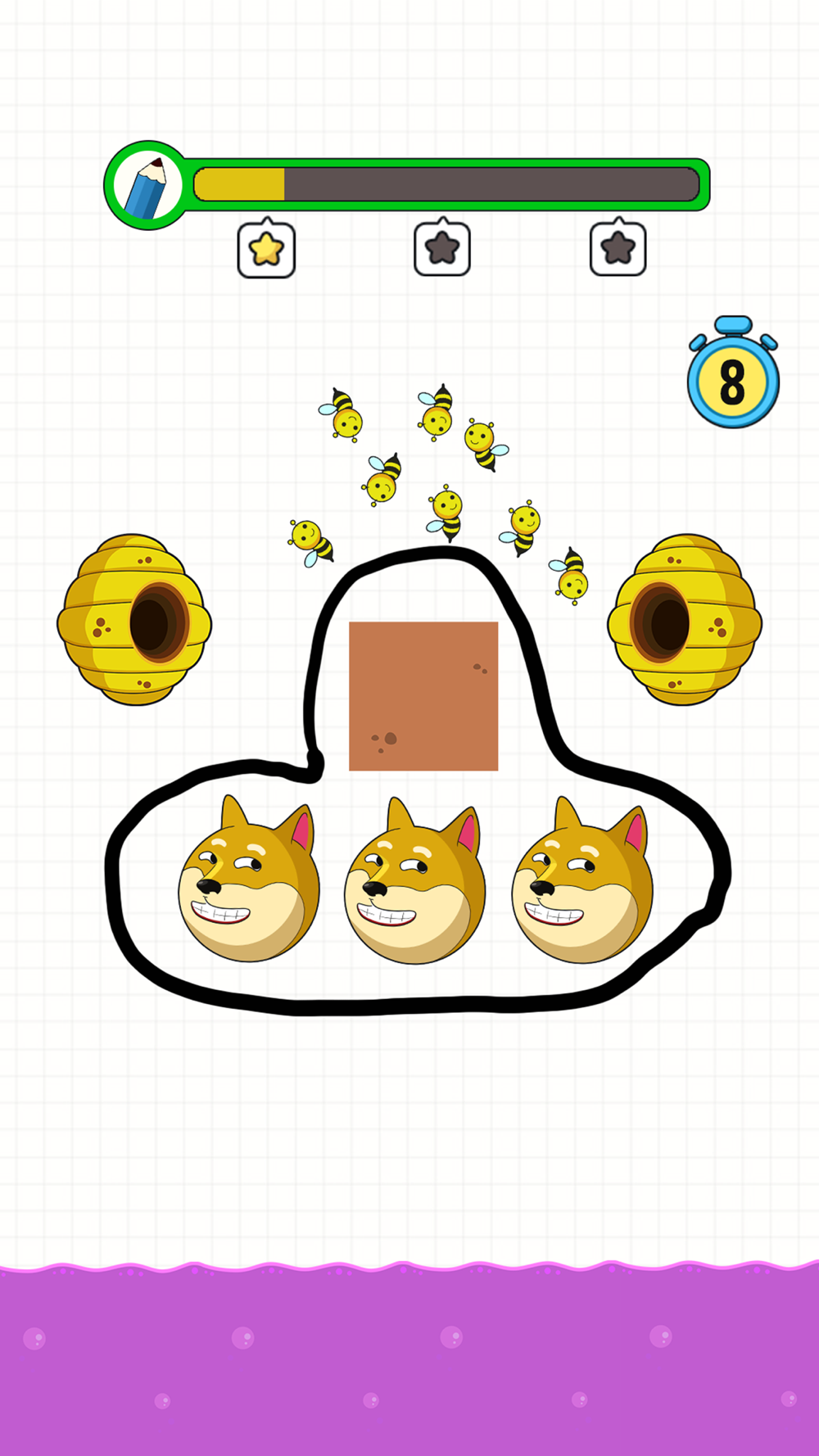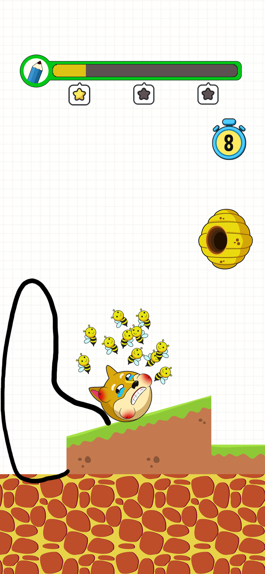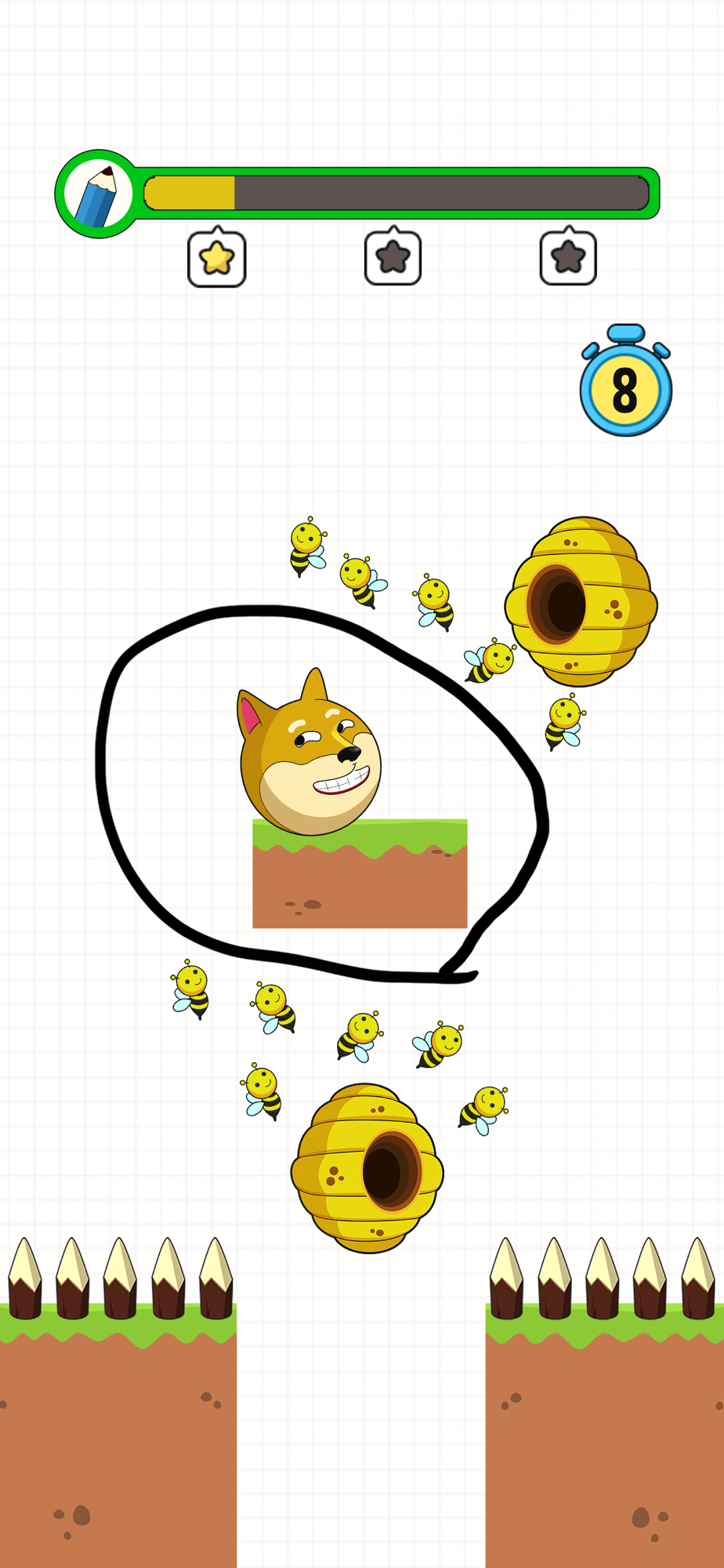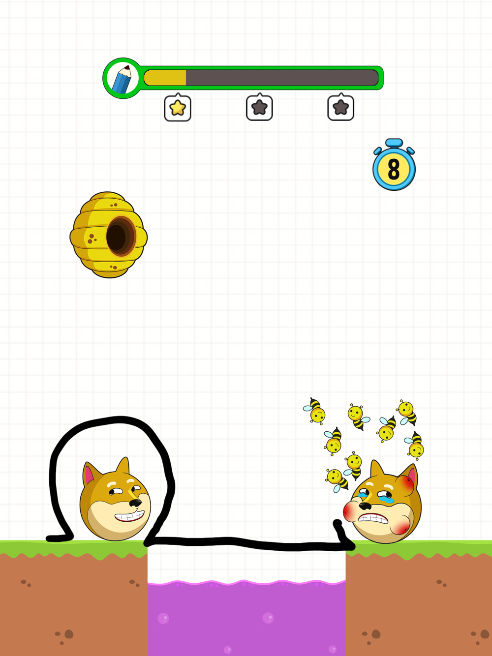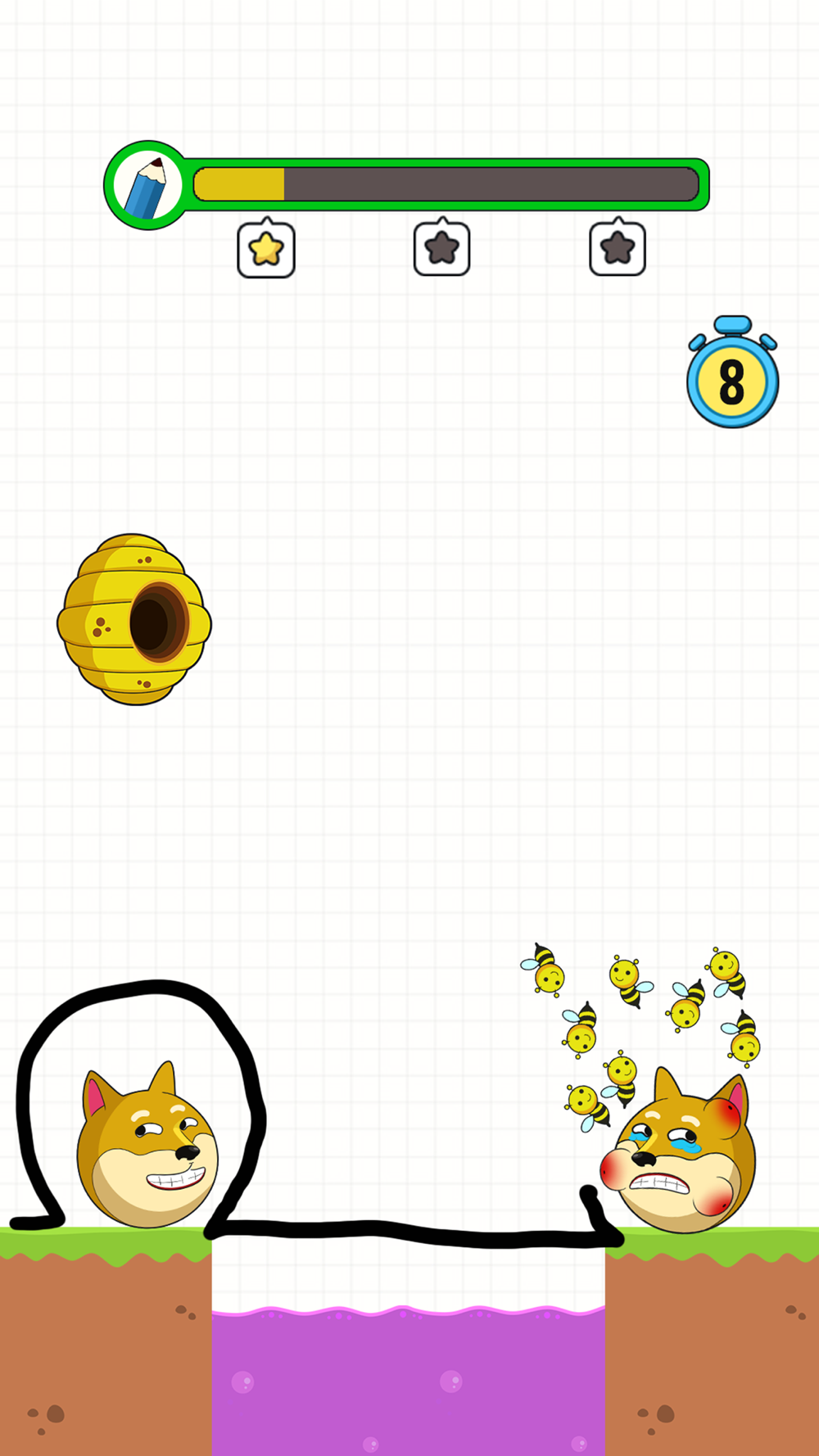 You can go on to the following level after saving the dog. The less ink you use, the higher rate you get. If you fail, please try to draw again to save the dog from bees. Try to win as many levels as you can this entertaining & simple game to sharpen your brain! Also, share with your friends and play save the dog bee together!