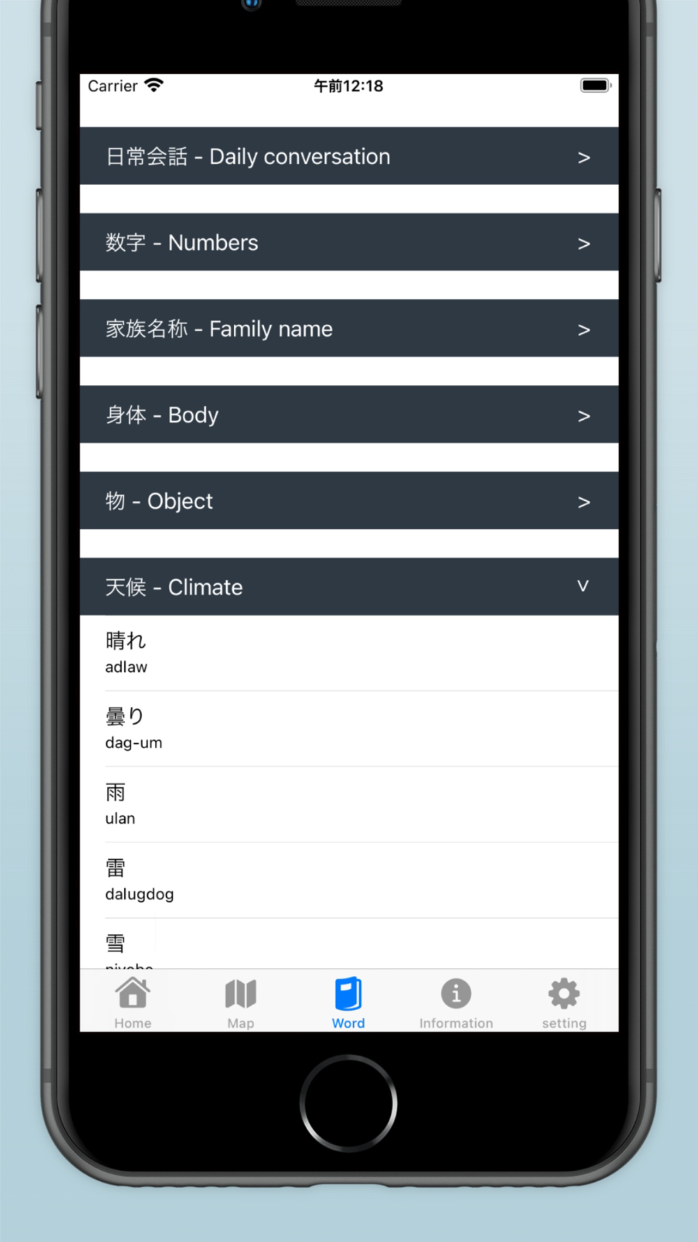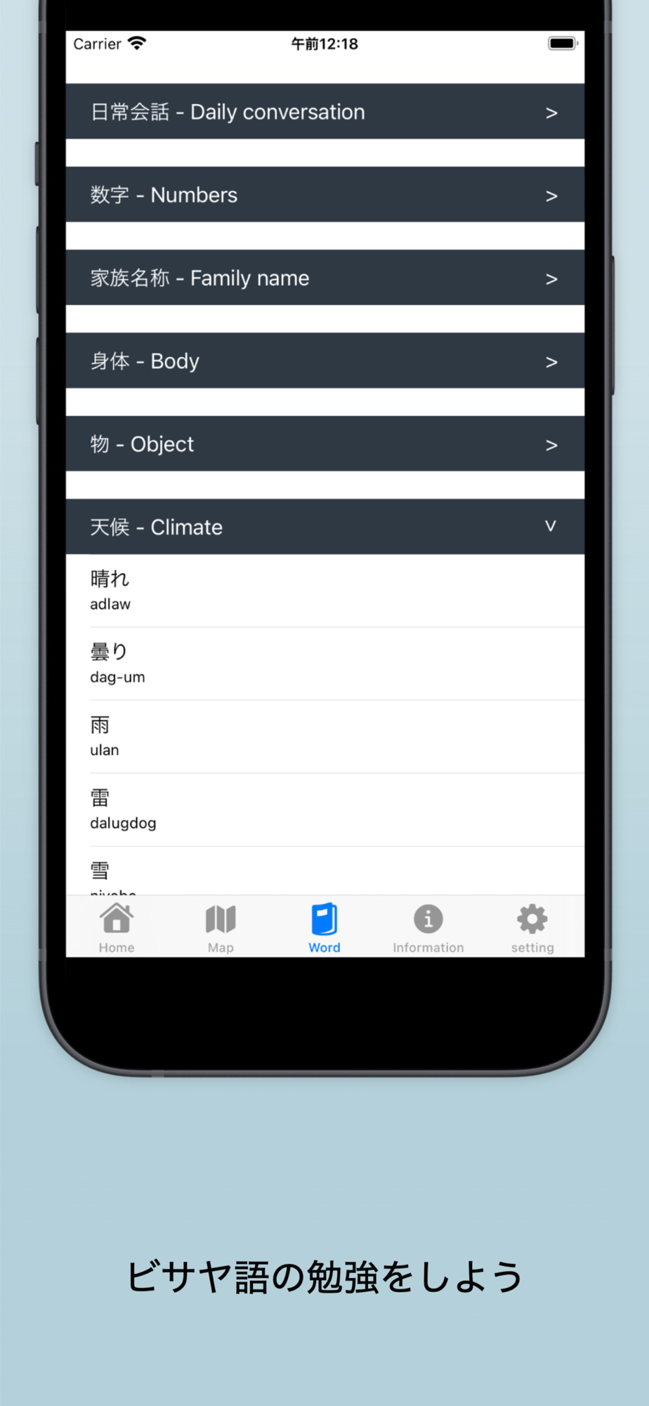・挨拶から日常で使いそうな単語まで確認でき勉強することができる