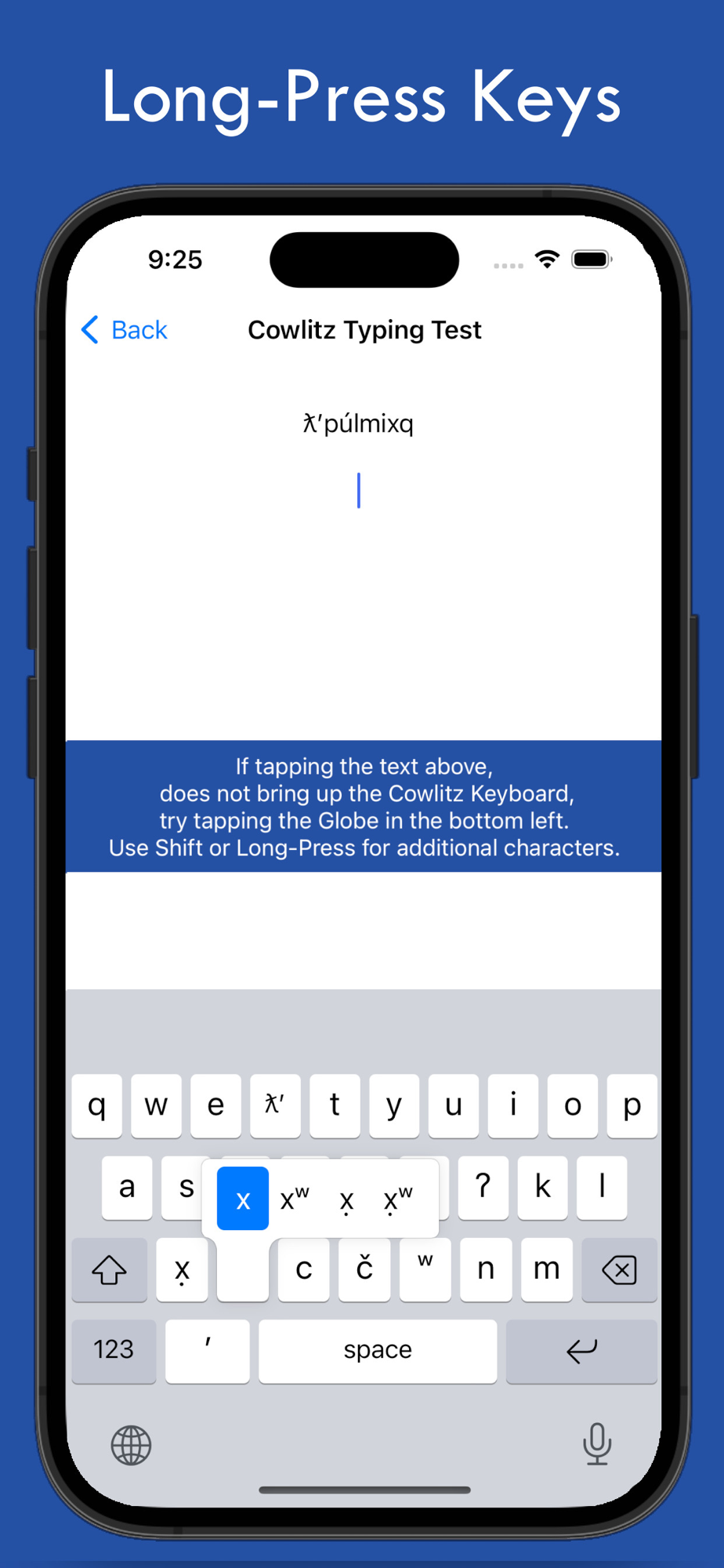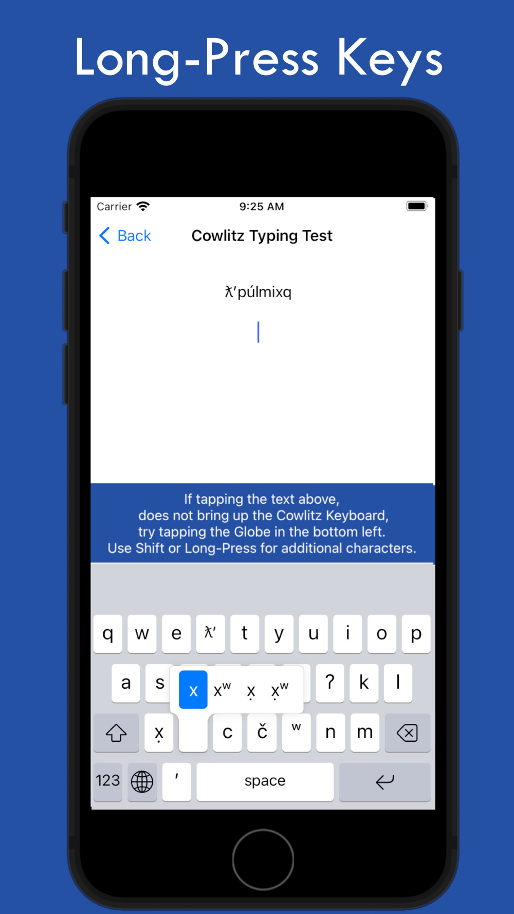 7. Press and hold letters to see additional Cowlitz Salish characters (hold x to see x', xw...)