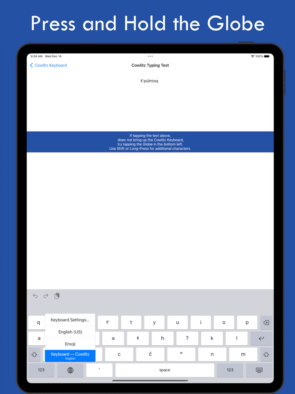 6. Tap or Press and Hold the Globe to switch to the "Cowlitz Salish Keyboard"