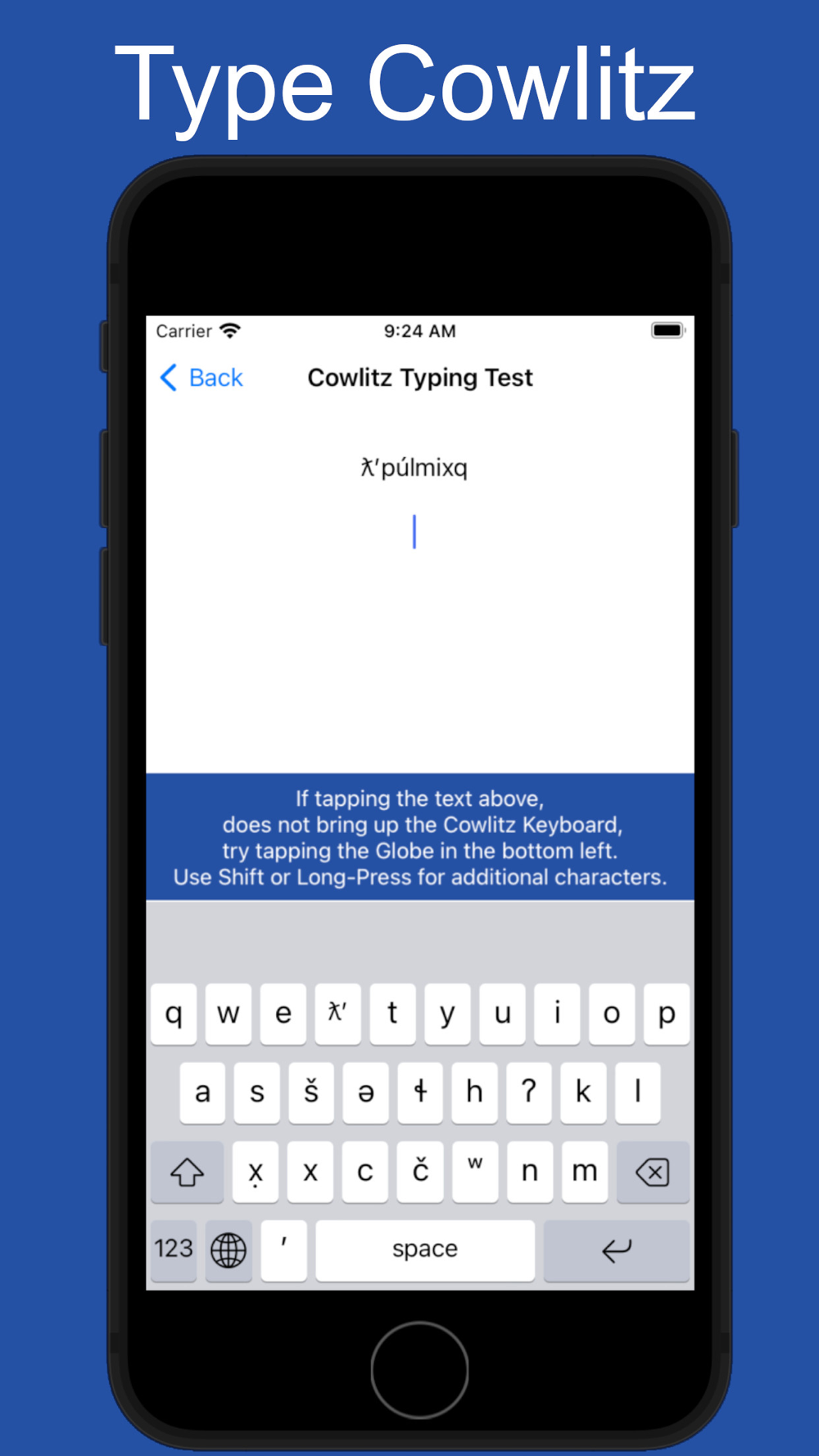 Cowlitz Salish Keyboard is the iOS app that lets you type correct Cowlitz Salish into any text area on your iOS mobile device by simply switching into the Cowlitz Salish Keyboard Layout.
