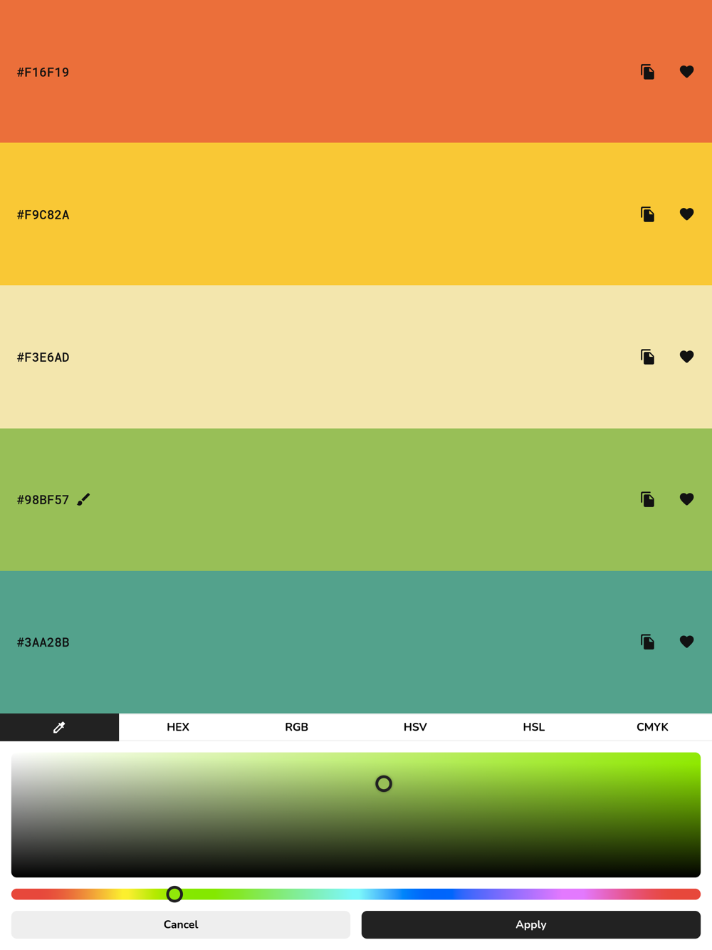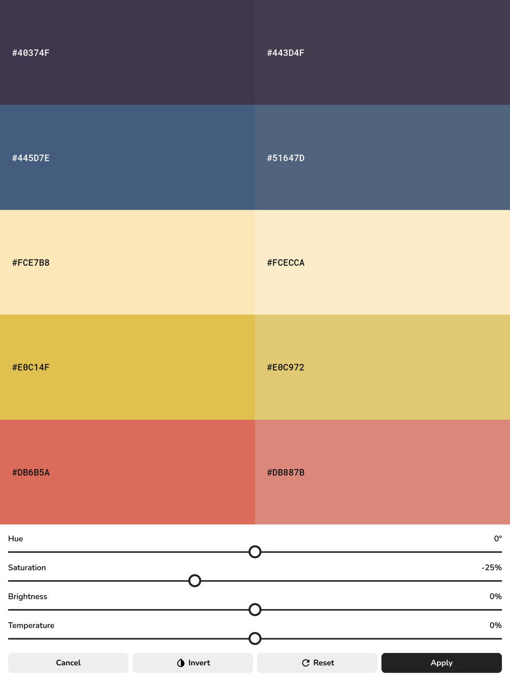 - Adjustable palette - Tweak the hue, saturation, brightness or temperature of the entire color palette.