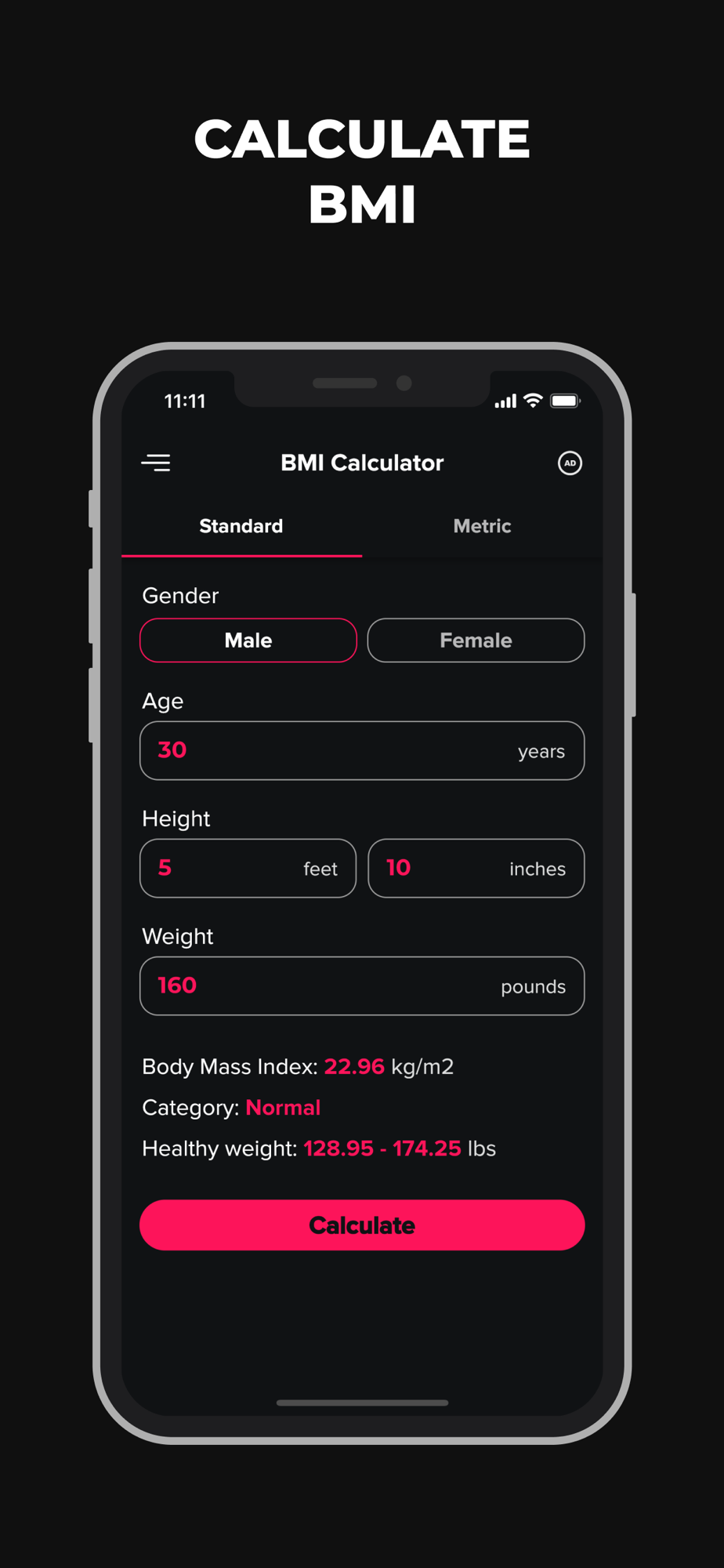 Embarking on your BMI tracking is as simple as inputting your gender, age, weight and height using standard or metric measures. Click the calculate button and find out if you're a healthy weight.