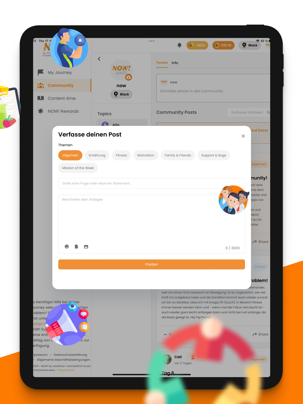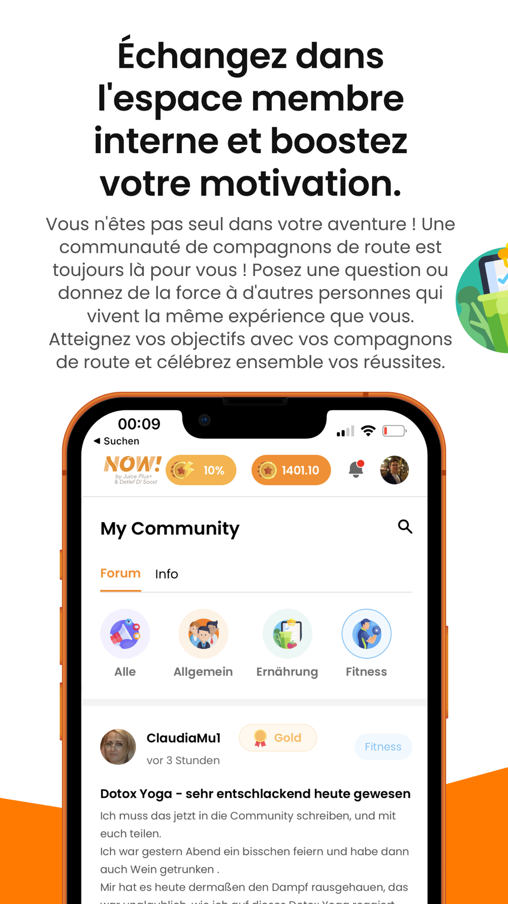 Vous n'êtes pas seul dans votre aventure ! Une communauté de compagnons de route est toujours là pour vous ! Échangez dans l'espace membre interne et boostez votre motivation, posez une question ou donnez de la force à d'autres personnes qui vivent la même expérience que vous. Atteignez vos objectifs avec vos compagnons de route et célébrez ensemble vos réussites. Régulièrement, nos coachs Kate et Detlef organisent des appels en direct auxquels vous pouvez assister.