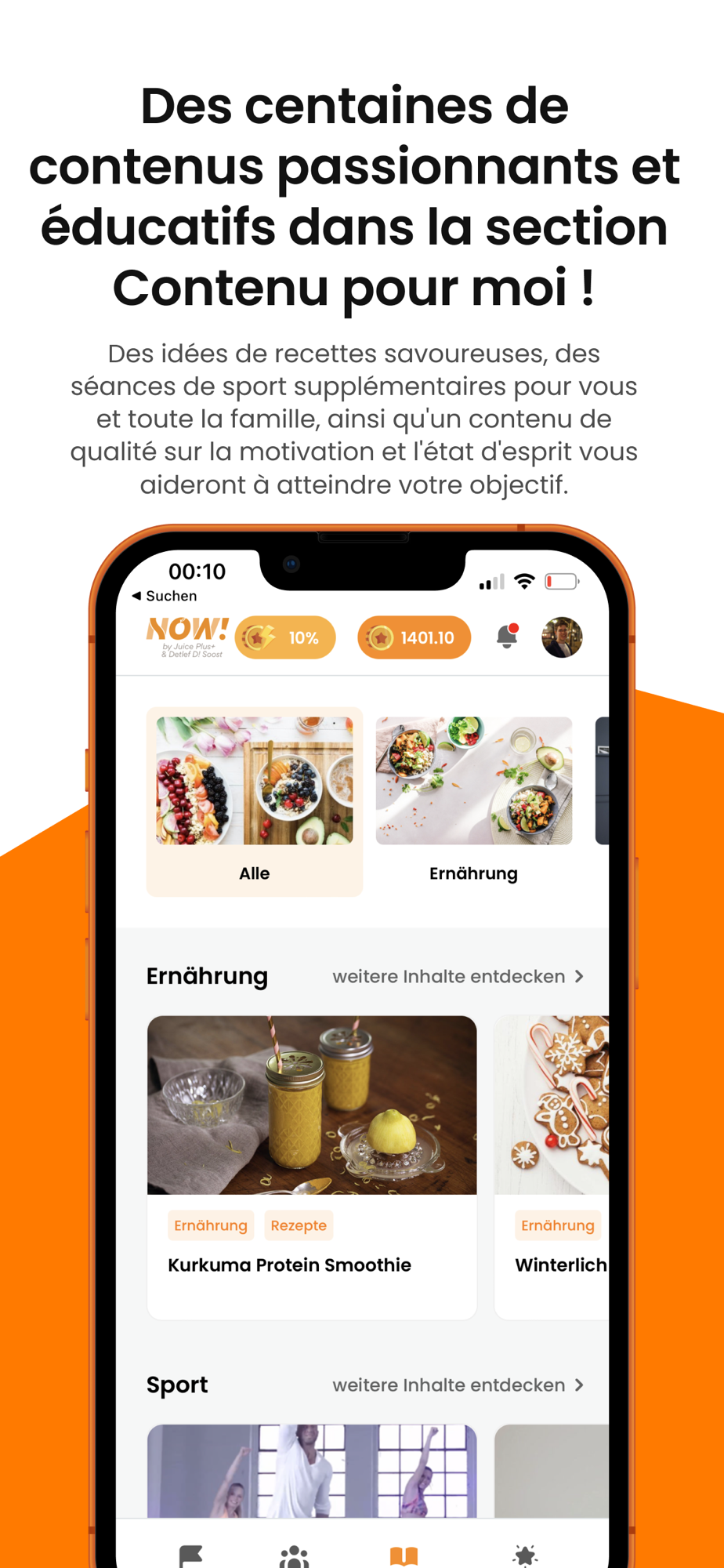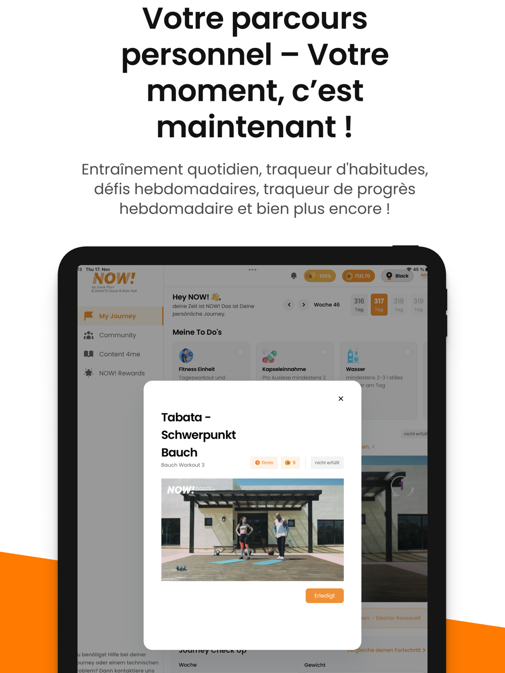 Réalité : commencer, c’est facile. Mais il est plus difficile de s'y tenir. C'est pourquoi nous avons créé les NOW! Rewards, notre système de récompenses qui vous permet de gagner de superbes prix pour votre persévérance. Vous avez accès à une énorme bibliothèque de vidéos et vous êtes régulièrement inspiré par les "Missions de la Semaine" que je vous propose, ce qui vous garantit de garder le cap. En bref, vous l'aurez compris : nous vous donnons le meilleur concept pour vous aider à atteindre vos objectifs.