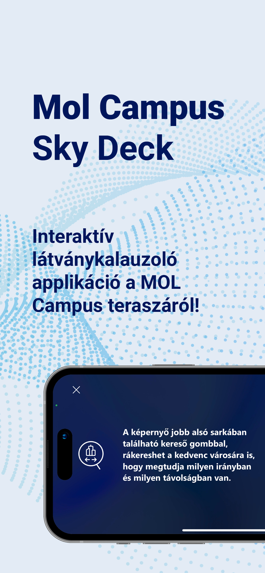Sky Deck application has been created for the visitors of the MOL Campus viewing deck. With the help of this app, you will be able to take a virtual walk in Budapest, getting a glimpse of the cultural life and tourism of the city or discover the location of other Hungarian cities. By using the app, the panoramic view can be complemented with an augmented reality based content. You can navigate between the attractions , by clicking on them you can read interesting details and see pictures on their information card, or you can also find out how far they are from the MOL Campus building. Turn towards the Gellért Hill or move your device towards National Theatre and explore the city! Gather information, wander through museums and sports facilities, or just discover the most important cities of Hungary! And finally, get to know us! Read about the history of the Mol Group, meet out branches in the countryside and find out where are the nearest Fresh Corner Cafés! All you need to do is to download the SkyDeck application and purchase a ticket to the Mol Campus viewing deck at www.molcampus.hu website to discover Budapest from a very special view you couldn’t see before, from 29 floors height!