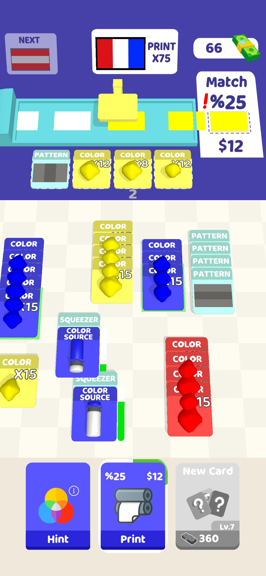 Get all the necessary things to print by buying cards! Use your sources wisely to earn money! You need to follow the targets to earn much more! You can merge colors to get new colors other than main colors!