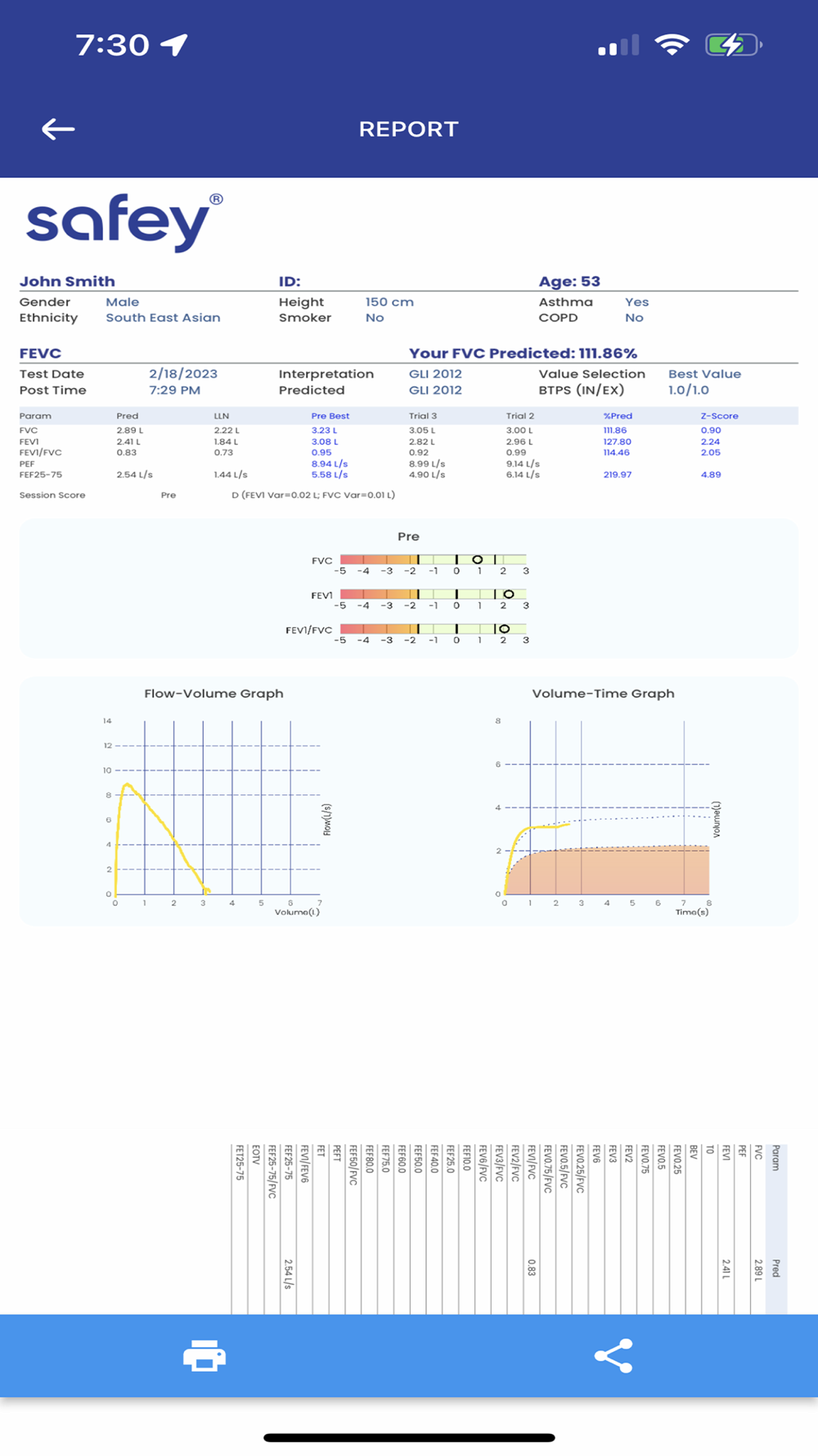 The Safey App communicates with Safey Peak Flow Meter and Safey Pocket Spirometer via Bluetooth. The app will measure following parameters: