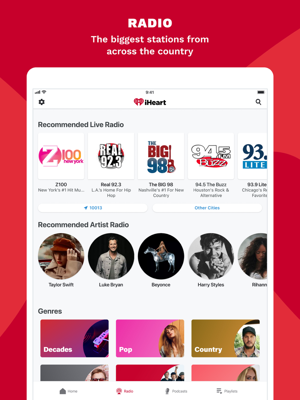 Build playlists to your liking and create personalized music stations from millions of songs covering Country, Pop, Hip Hop, R&B, Rock and so much more. Take advantage of a weekly mixtape that’s tailored to you and discover new sounds with ease — all available on the free iHeartRadio app.