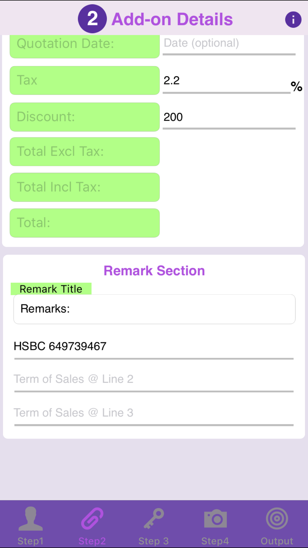 Feature of save/load function has provided a quick way to save yours' & clients' details. Alternative, client details can be "saves or loads" via your phone's Contacts.