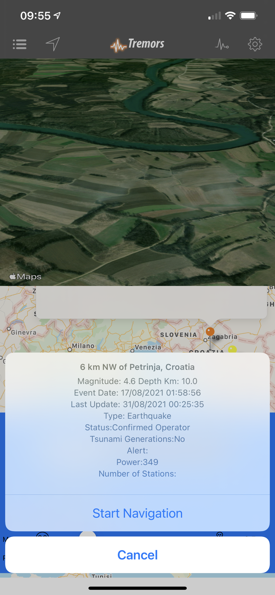 - Ability to start "Navigation" to the point of the earthquake