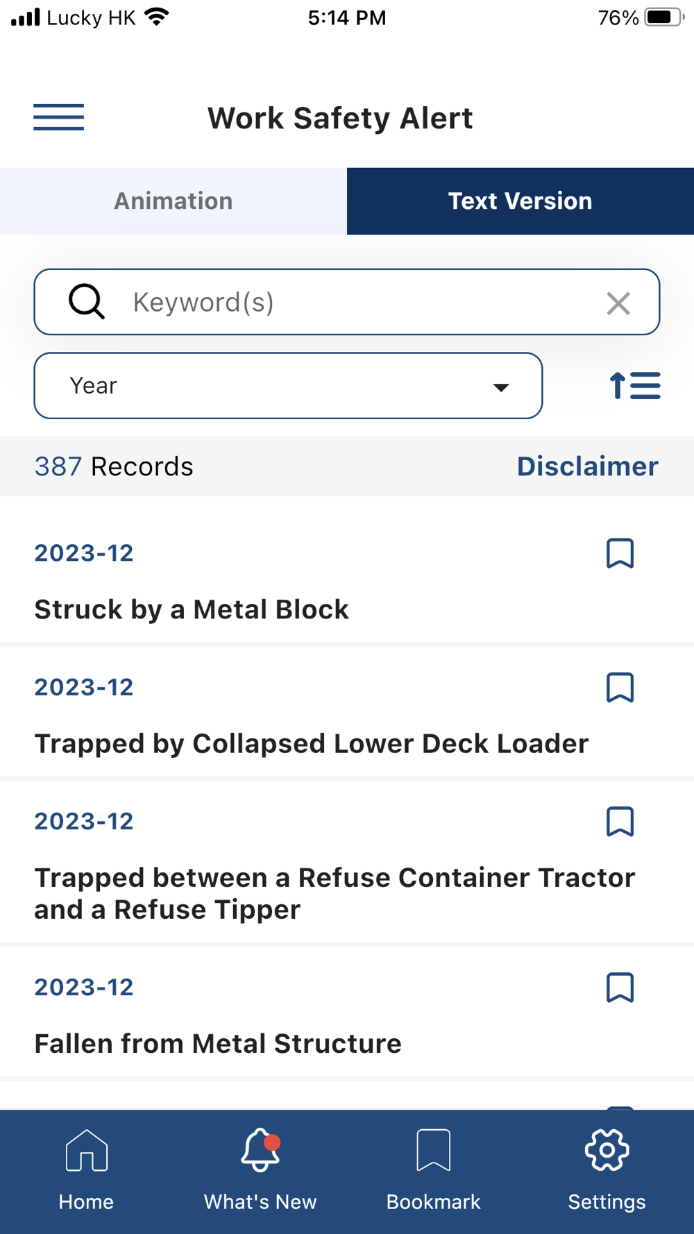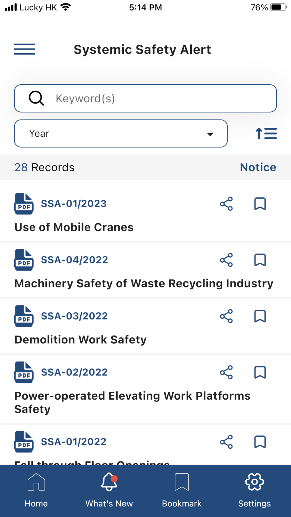 This mobile application aims to provide the latest occupational safety and health information. The newly designed Work Safety Alert mobile application combines an enhanced user interface with various new features:• Work Safety Alert (text and animation)• OSH Training• Online OSH Complaint Form• Systemic Safety Alert• Catering Safety Animation• Important Announcement• Special OSH Episode• Safety Hints