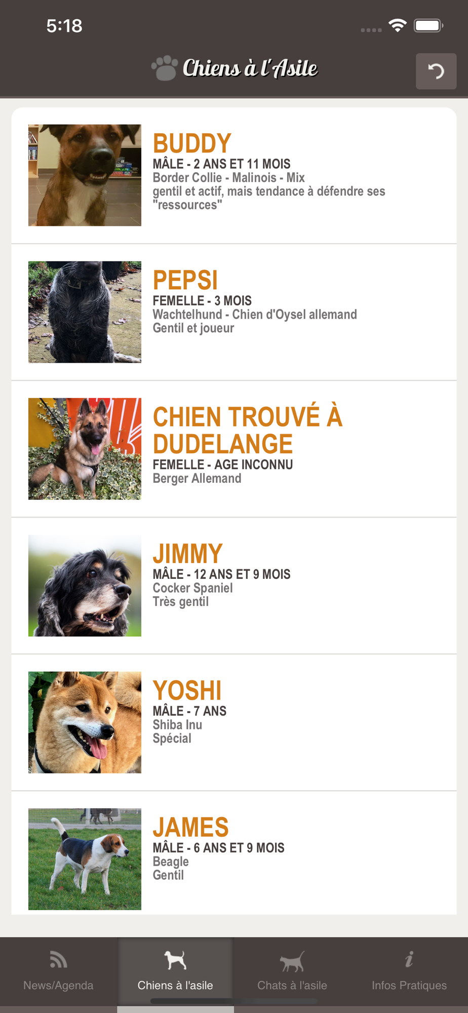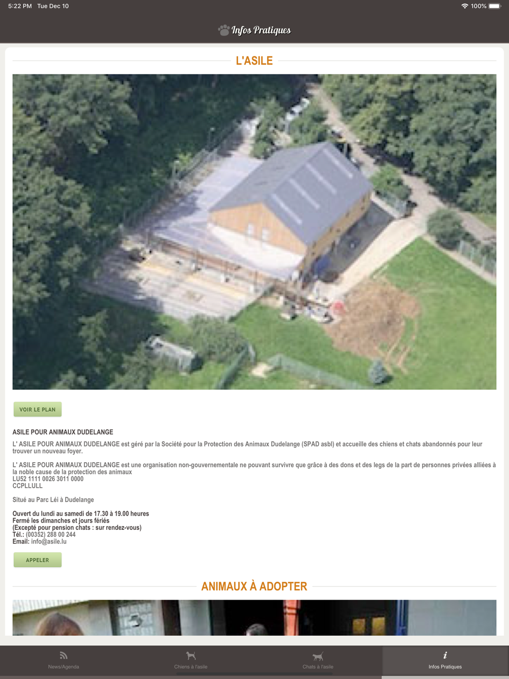 Avec l'application iPhone de l'asile pour animaux de Dudelange, adoptez d'urgence l'outil interactif de tous ceux qui aiment les animaux au Luxembourg. Il vous permettra de retrouver l'ensemble des chats et des chiens à adopter mais également de consulter les dernières activités du centre et toutes les informations pratiques.